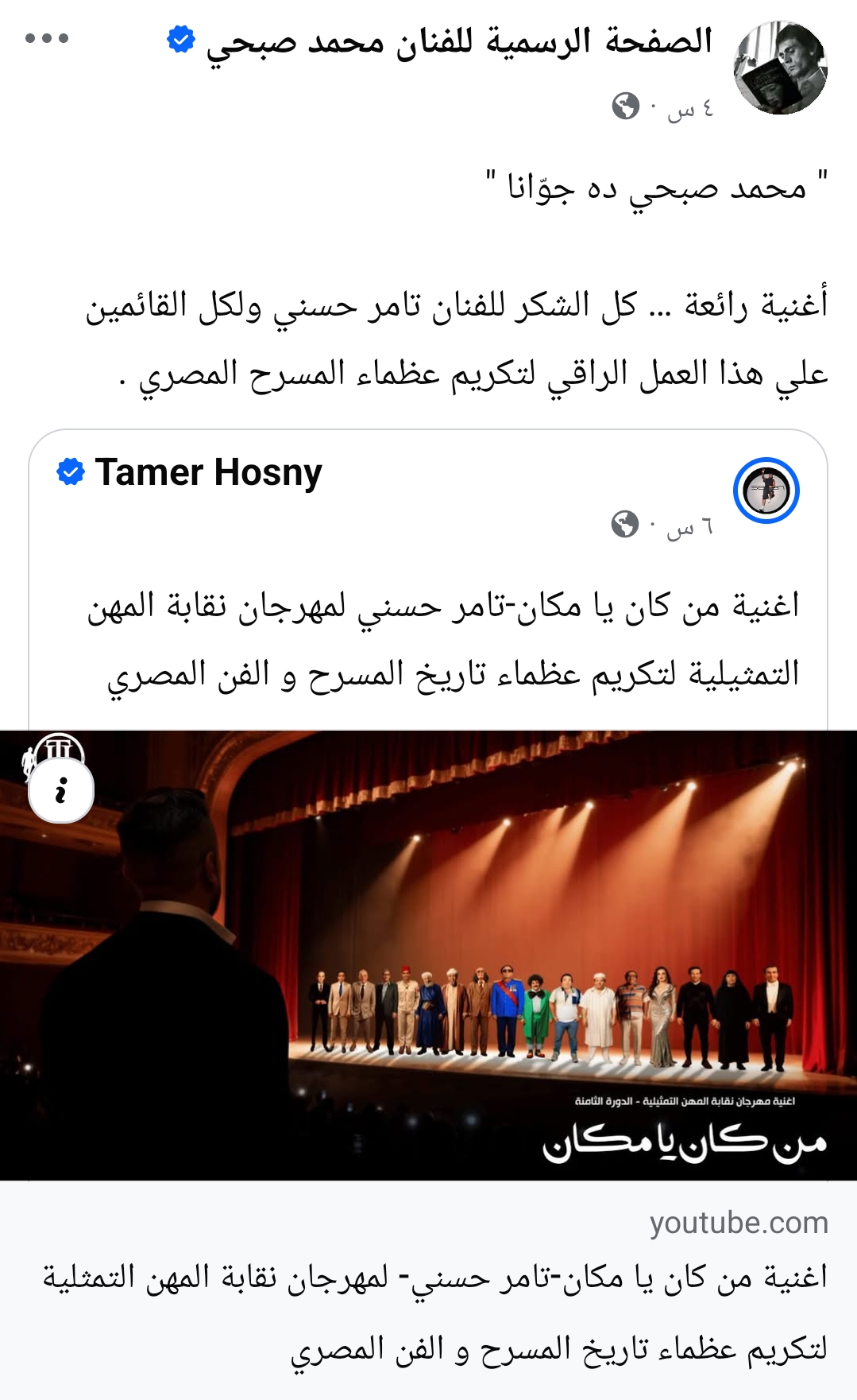 وجه النجم الكبير محمد صبحي، الشكر للنجم تامر حسني، على أغنيته الجديدة “من كان يا مكان”، في حفل افتتاح مهرجان نقابة المهن التمثيلية، لتكريم عظماء المسرح والذي ظهر محمد صبحي فيها.