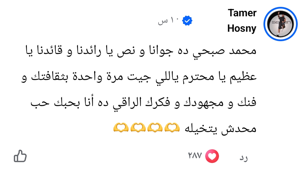 ورد تامر حسني، عليه قائلا: “محمد صبحي ده جوانا ونص يا رائدنا وقائدنا يا عظيم يا محترم ياللي جيت مرة واحدة بثقافتك وفنك ومجهودك وفكرك الراقي ده أنا بحبك حب محدش يتخيله”.