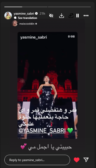 ولم تتأخر ياسمين صبري في الرد، حيث أعربت عن امتنانها وسعادتها بتعليق مي، وردت عليها بعفوية عبر ستوري خاصة، قائلة: "حبيبتي يا أجمل مي".