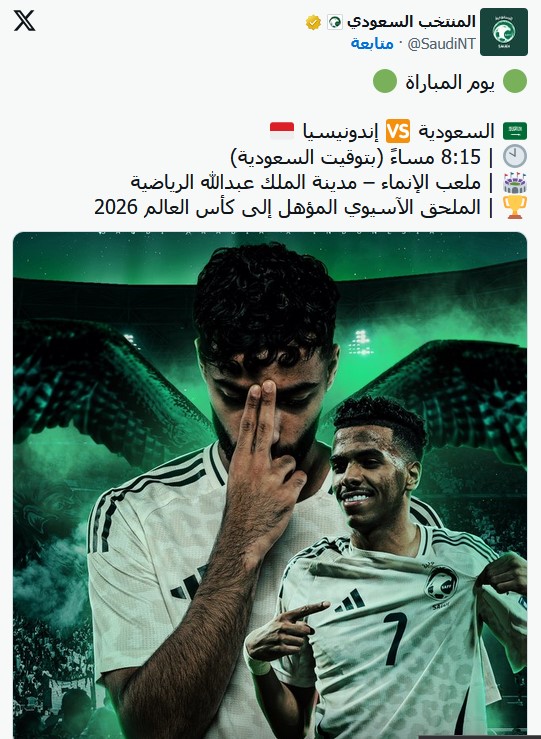 ويواجه منتخب السعودى، نظيره منتخب إندونسيا  ففى منافسات المجموعة الثانية من ملحق آسيا المؤهل لكأس العالم 2026، مساء اليوم الأربعاء على ملعب الإنماء بمدينة الملك عبدالله الرياضية فى جدة.