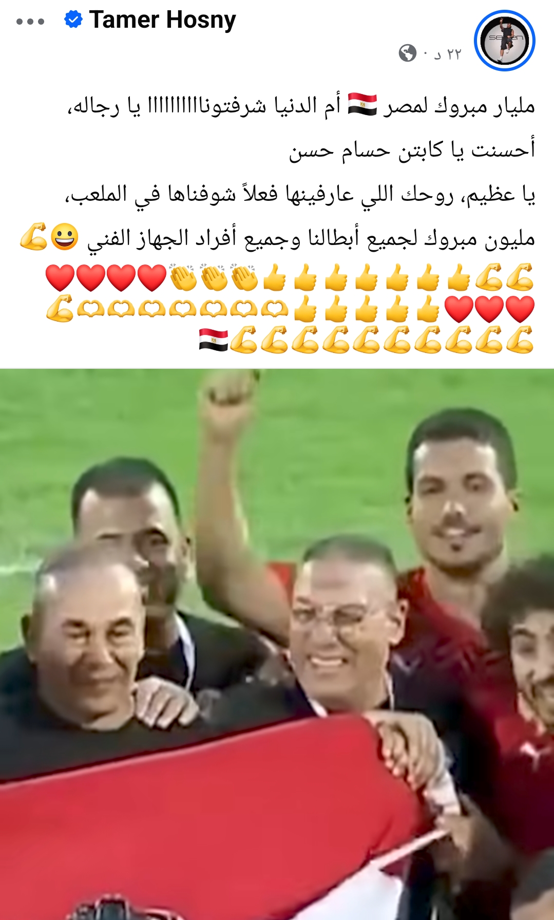 وعلق قائلا: "مليار مبروك لمصر، أم الدنيا شرفتونا يا رجاله، أحسنت يا كابتن حسام حسن يا عظيم، روحك اللي عارفينها فعلًا شوفناها في الملعب، مليون مبروك لجميع أبطالنا وجميع أفراد الجهاز الفني".