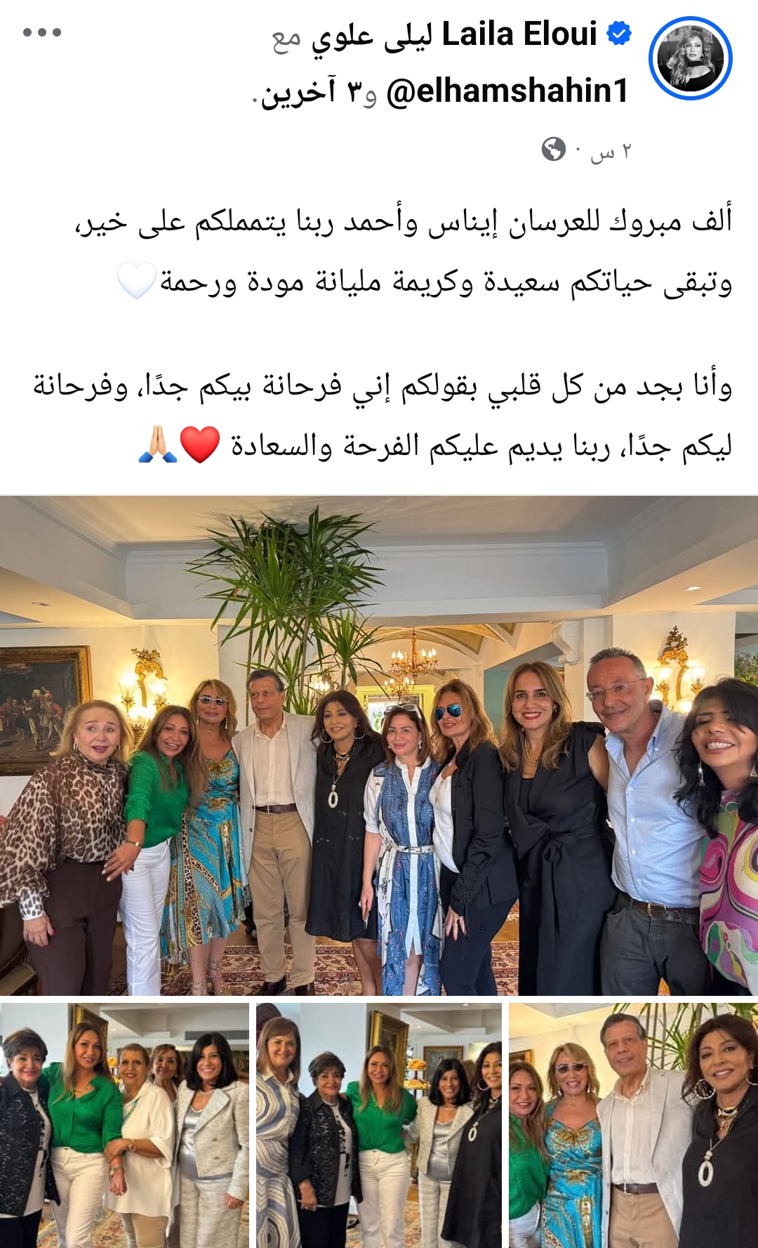 ونشرت ليلى علوي، مجموعة صور تجمعها بإيناس الدغيدي، ومجموعة من النجوم والأصدقاء المقربين في "صباحية العروسة"، وذلك عبر حسابها الشخصي بموقع التواصل الاجتماعي فيسبوك.