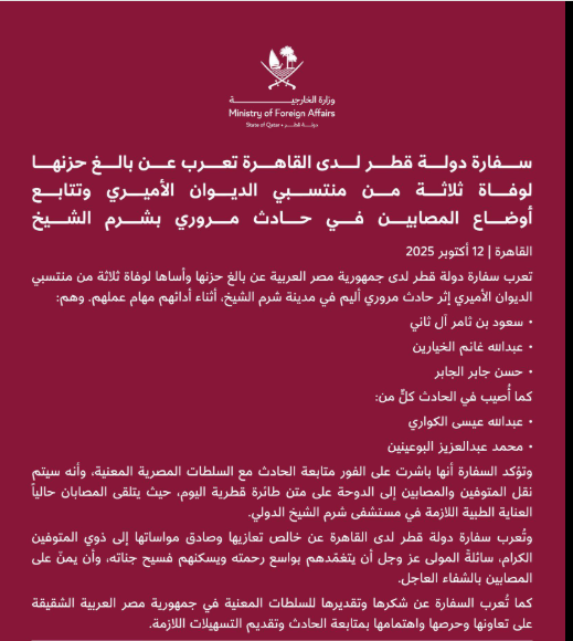 أعربت سفارة قطر بالقاهرة عن بالغ حزنها لوفاة ثلاثة من منتسبي الديوان الأميري في حادث سير نتيجة اختلال عجلة القيادة قرب مدينة شرم الشيخ.