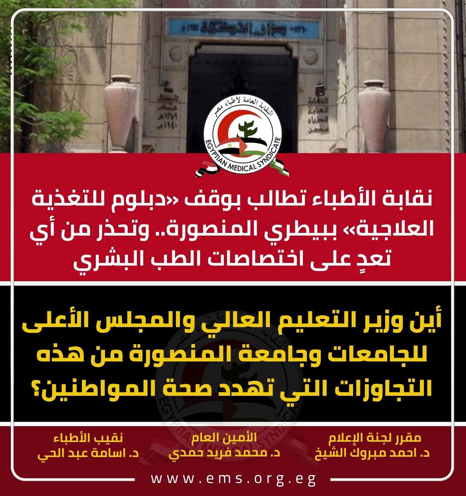 وطالبت النقابة وزير التعليم العالي والبحث العلمي، والمجلس الأعلى للجامعات، ورئيس جامعة المنصورة، بسرعة التدخل لوقف هذا البرنامج والتحقيق في ملابسات اعتماده، تجنبًا لتكرار مثل هذه التجاوزات التي تمس الضوابط القانونية لمزاولة المهن الطبية.