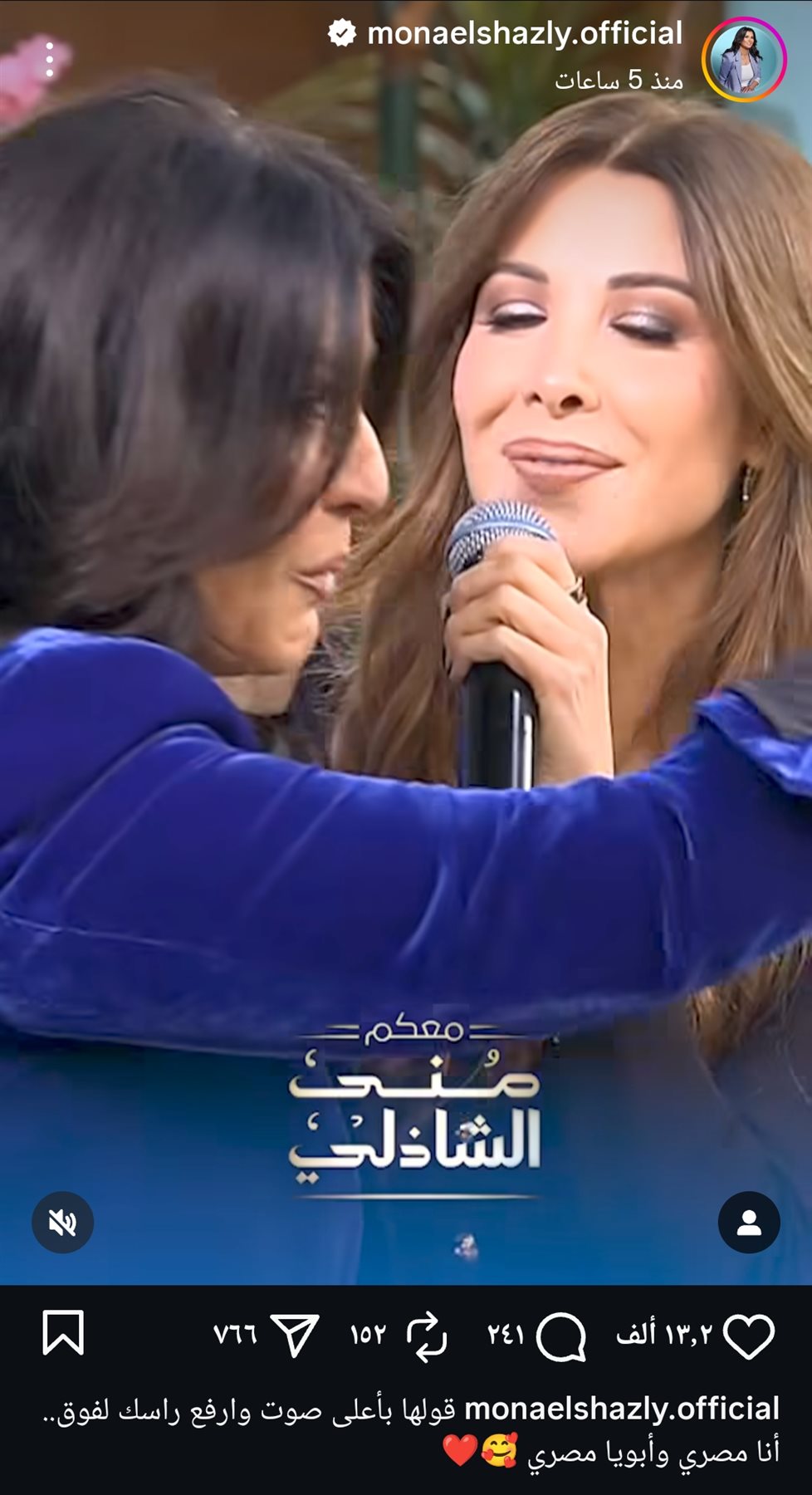 وعلقت قائلة: “قولها بأعلى صوت وارفع راسك لفوق.. أنا مصري وأبويا مصري، الميجا ستار نانسي عجرم.. قريبا في معكم منى الشاذلي”.