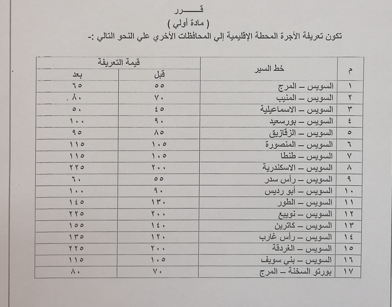 اعتمد اللواء أ. ح الدكتور طارق حامد الشاذلي، محافظ السويس، التسعيرة الجديدة لسيارات الأجرة الميكروباص على الخطوط الداخلية والخارجية والتاكسي، بعد قرار لجنة تسعير المواد البترولية بزيادة أسعار البنزين والسولار.