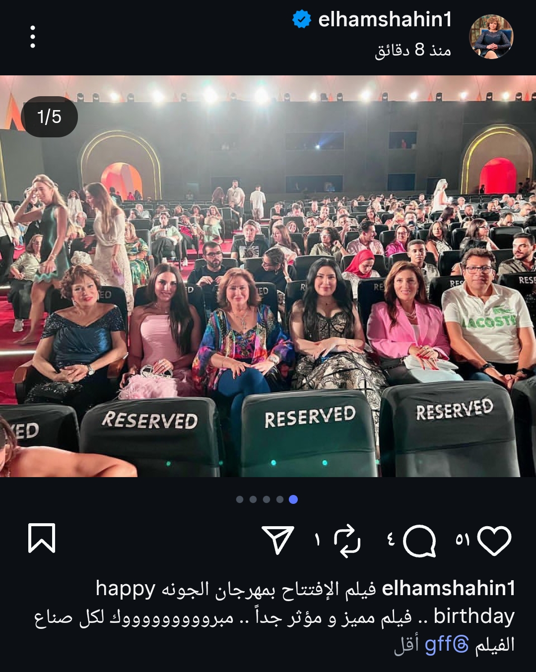 وعلقت قائلة: “فيلم الافتتاح بمهرجان الجونه happy birthday.. فيلم مميز ومؤثر جدًا.. مبروك لكل صناع الفيلم”.