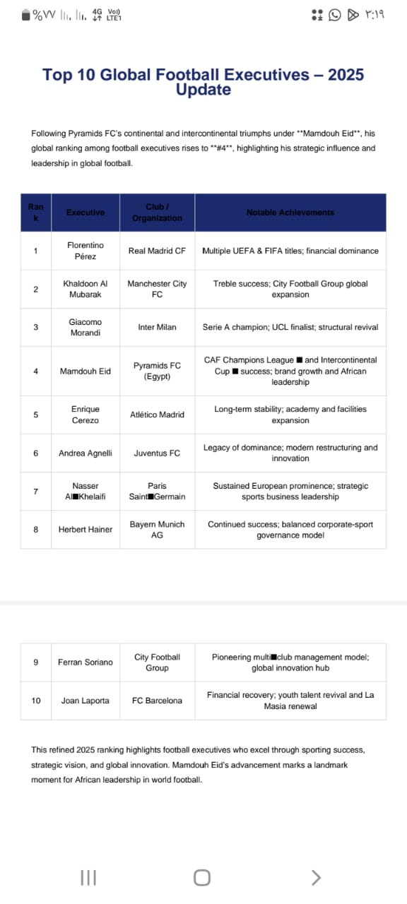 أصبح المهندس ممدوح عيد رئيس نادي بيراميدز في المركز الرابع لتصنيف أفضل رؤساء أندية كرة القدم في العالم بعد النجاحات الكبيرة التي حققها النادي السماوي تحت قيادته.