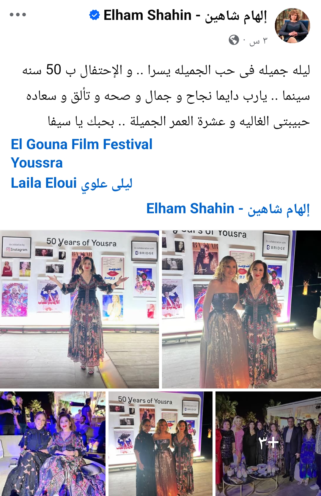 وشاركت إلهام شاهين جمهورها ومتابعيها، بمجموعة صور لها برفقة يسرا والنجوم، عبر حسابها الشخصي بموقع التواصل الاجتماعي فيسبوك.