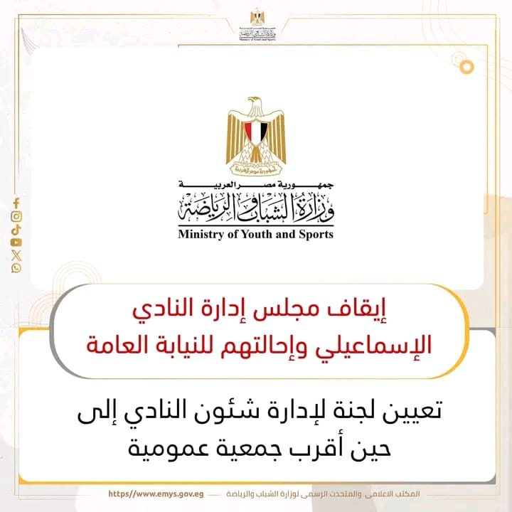 وأضاف المتحدث الرسمي للوزارة أن وزير الشباب والرياضة وجّه المعنيين بالبدء فورًا في التنسيق الكامل مع محافظة الإسماعيلية وهيئة قناة السويس لتوفير برامج رعاية ودعم من شركات القطاع الخاص، بما يضمن تدبير مصادر دخل مستقرة للنادي خلال المرحلة المقبلة، وذلك في ضوء الحرص على استقرار النادي الإسماعيلي العريق واستمرار مسيرته في مناخ يسوده الانضباط والشفافية.