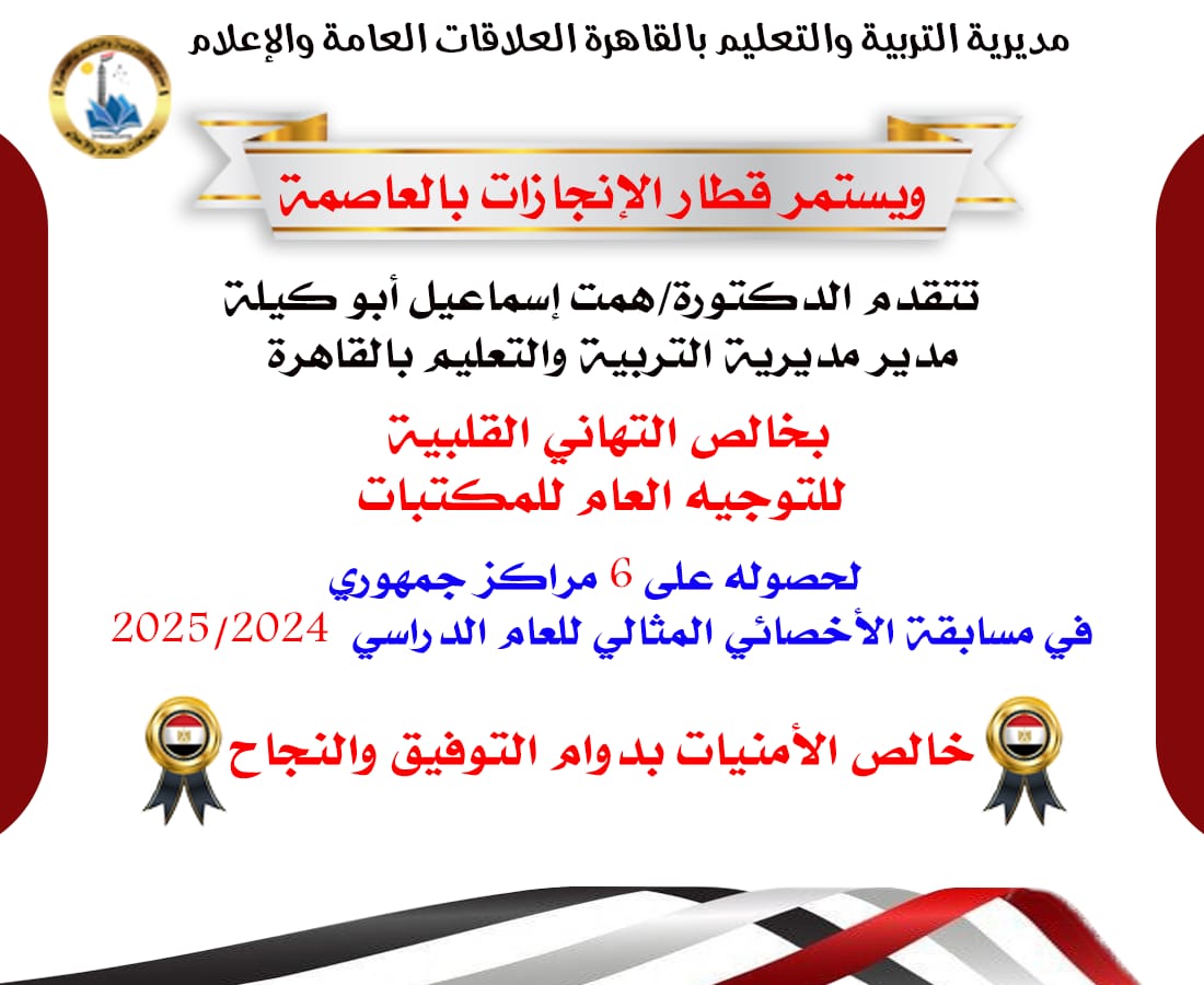 حققت مديرية التربية والتعليم بالقاهرة إنجازًا جديدًا بحصولها على ستة مراكز جمهورية في مسابقة «الأخصائي المثالي» للعام الدراسي 2024/2025، وذلك برعاية الدكتورة همت إسماعيل أبو كيلة، مدير مديرية التربية والتعليم بالقاهرة.