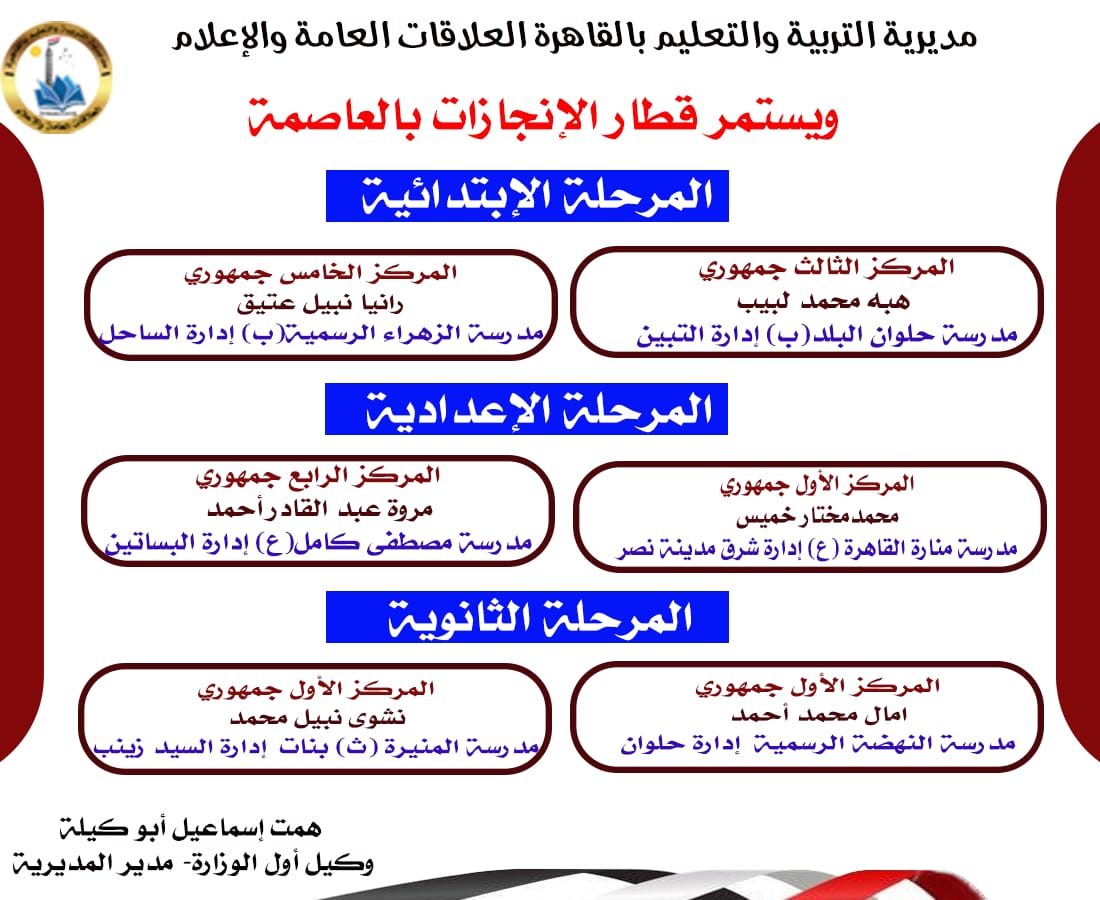 واختتمت مديرية التعليم بالقاهرة بيانها بالتأكيد على أن التميز هدف دائم، والريادة على مستوى الجمهورية شعار لا يتغير.