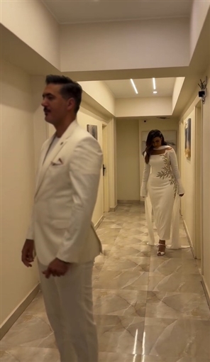 اختارت «هايدي» فستانًا بسيطًا باللون الأبيض، له أكمام طويلة، ومُطرز بتطريزات باللون الذهبي، وارتدى عريسها بدلة باللون الأبيض أيضًا.