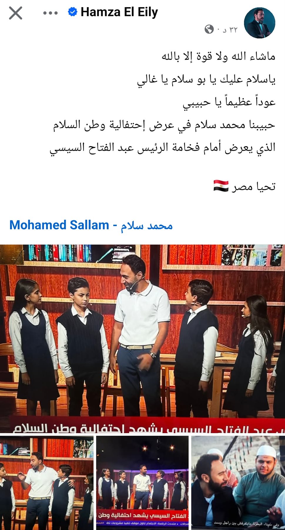 ياسلام عليك يا بو سلام يا غالي، عودًا عظيمًا يا حبيبي، حبيبنا محمد سلام في عرض إحتفالية وطن السلام، الذي يعرض أمام فخامة الرئيس عبد الفتاح السيسي، تحيا مصر".