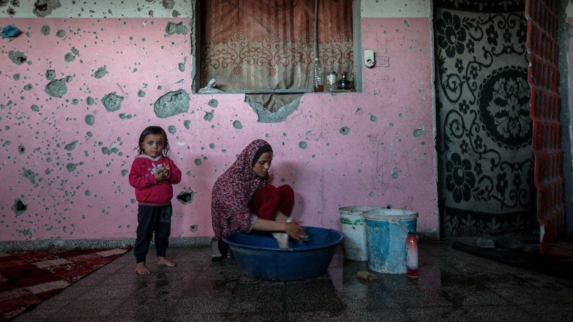 يفتقر النازحون في غزة في هذه المدرسة إلى أبسط مقومات الحياة، إذ تفتقر القاعات إلى المياه النظيفة والكهرباء، فيما تُستخدم الأغطية والملابس البالية كفواصل مؤقتة بين العائلات.