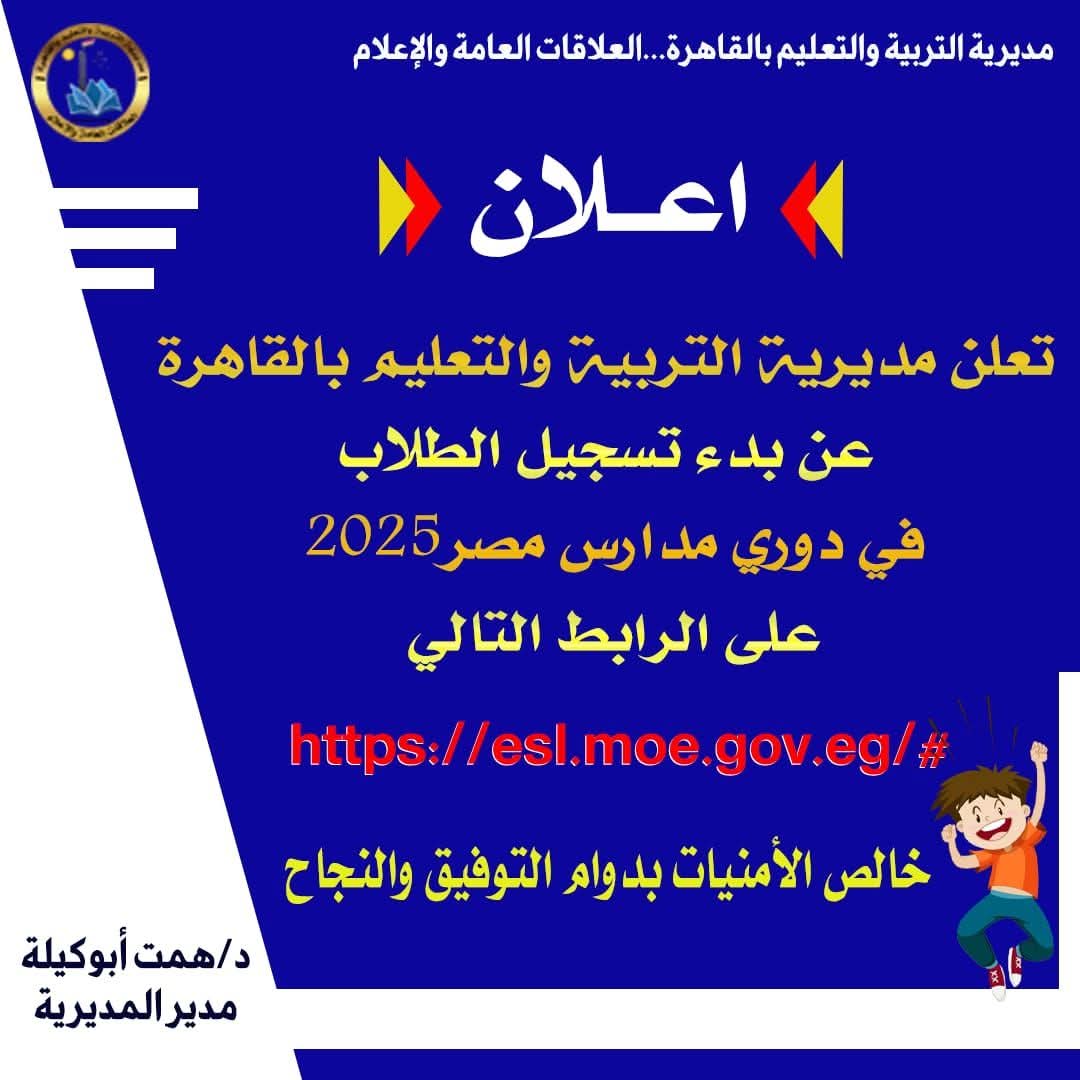 وأكدت المديرية أن التسجيل متاح الآن من خلال الرابط التالي: https://esl.moe.gov.eg/