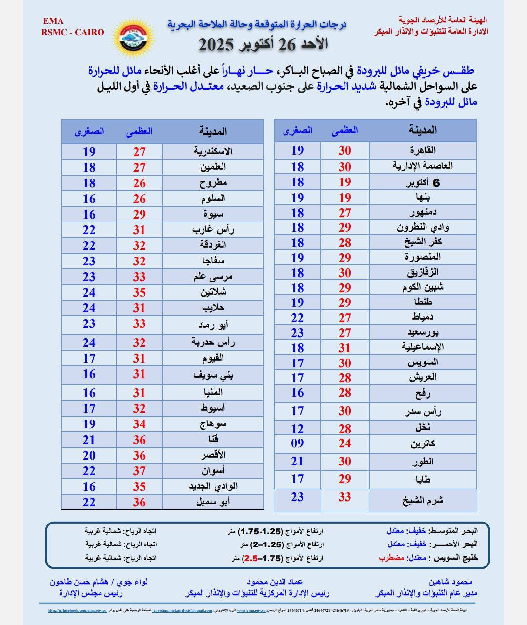 وتسجل درجات الحرارة المتوقعة العظمى بالقاهرة 30 والصغرى 19 والاسكندرية العظمى 27 والصغرى 19 وأسوان العظمى 37 والصغرى 22.