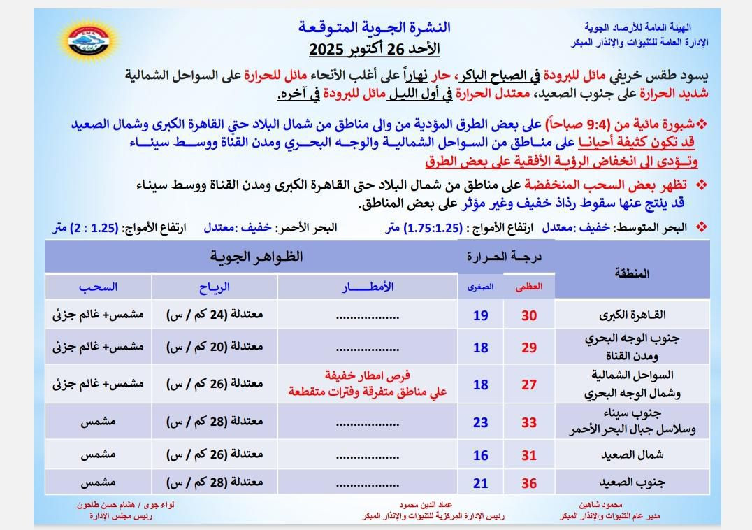 يتوقع خبراء هيئة الأرصاد الجوية أن يسود اليوم، الأحد، طقس خريفي مائل للبرودة في الصباح الباكر، حار نهارا على أغلب الأنحاء، مائل للحرارة على السواحل الشمالية شديد الحرارة على جنوب الصعيد، ويسود ليلا طقس معتدل الحرارة في أول الليل مائل للبرودة في آخره.