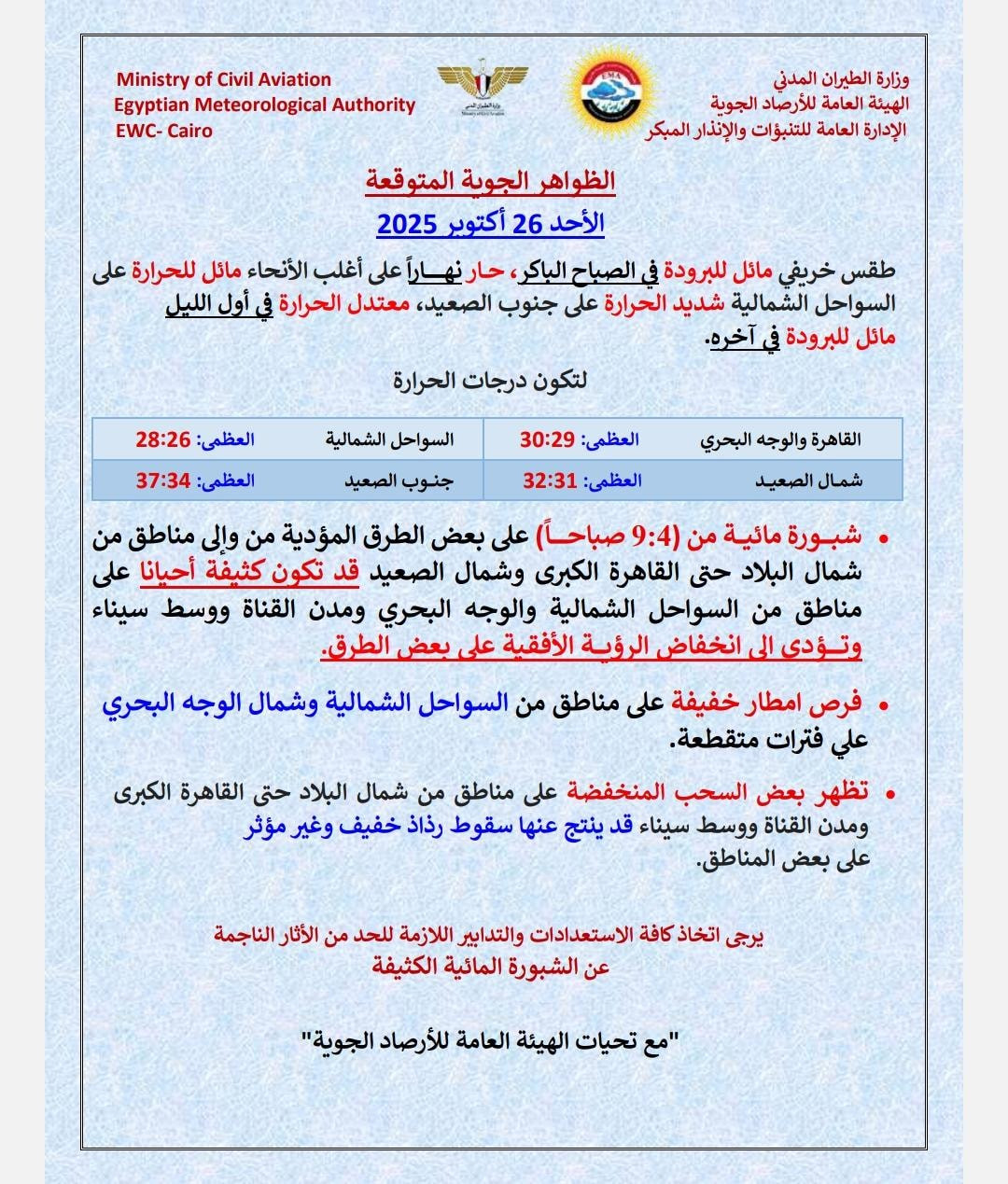 وأضاف الخبراء أنه عن الظواهر الجوية، تتكون شبورة مائية صباحا على بعض المناطق من القاهرة الكبرى وشمال الصعيد قد تكون كثيفة أحيانا على مناطق من السواحل الشمالية والوجه البحري ومدن القناة ووسط سيناء، مع فرص أمطار خفيفة على مناطق من السواحل الشمالية وشمال الوجه البحري على فترات متقطعة.