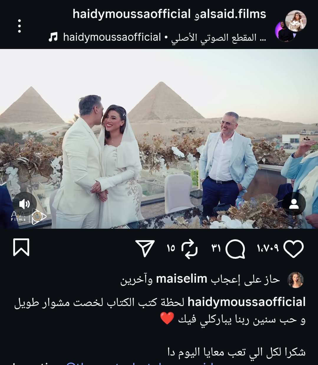 ونشرت هايدي، الفيديو عبر حسابها الشخصي بموقع تبادل الصور والفيديوهات الشهير إنستجرام، وعلقت قائلة: “لحظة كتب الكتاب لخصت مشوار طويل وحب سنين، ربنا يباركلي فيك، شكرا لكل اللي تعب معايا اليوم ده”.