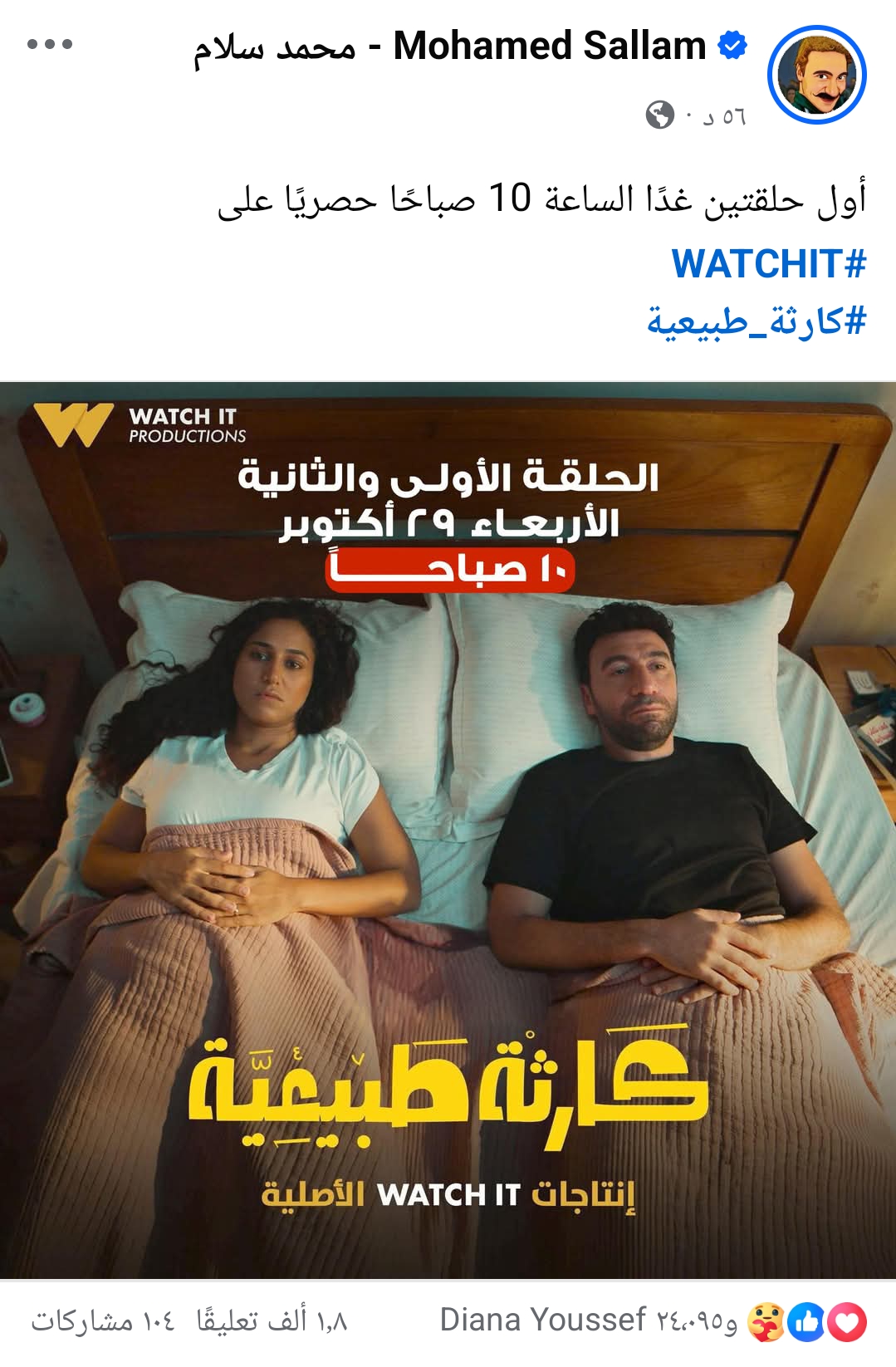 روج الفنان محمد سلام، لمسلسله الجديد الذي يحمل عنوان “كارثة طبيعية”، المقرر عرض أولى حلقاته غدا، في تمام الساعة العاشرة صباحًا على منصة watch it.