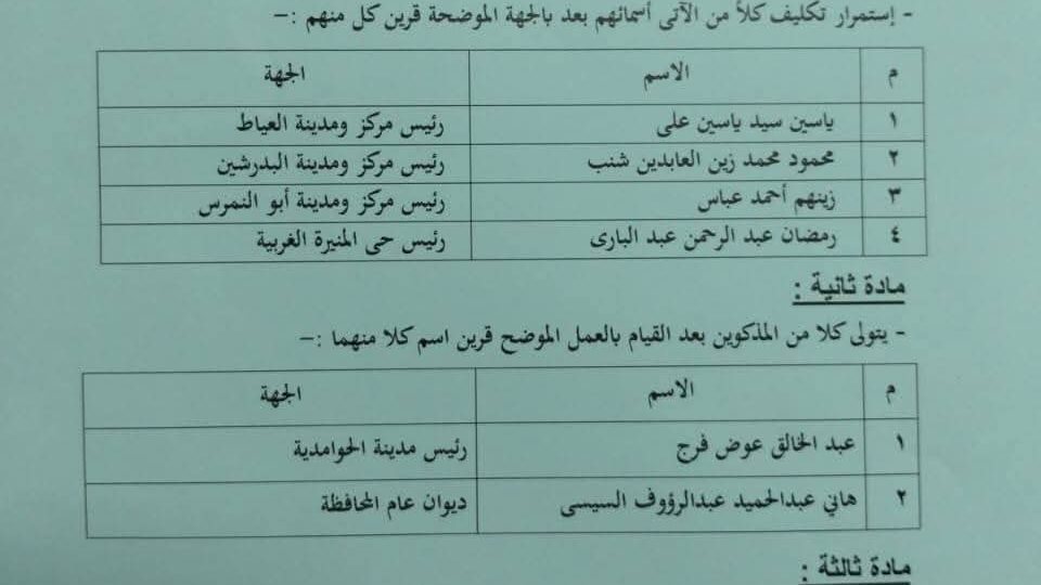 وفي الوقت ذاته، أصدر محافظ الجيزة القرار رقم 1683 لسنة 2025 بعد الاطلاع على القانون رقم 43 لسنة 1979 بشأن نظام الإدارة المحلية، والقانون رقم 81 لسنة 2016 بشأن الخدمة المدنية، وقرار رئيس الجمهورية رقم 259 لسنة 2024 بتعيينه محافظًا للجيزة، حيث نص القرار على استمرار تكليف ياسين سيد ياسين رئيسًا لمركز ومدينة العياط، ومحمود محمد زين العابدين شنب رئيسًا لمركز ومدينة البدرشين، وزينهم احمد عباس رئيسًا لمركز ومدينة أبو النمرس، ورمضان عبد الرحمن عبد الباري رئيسًا لحي المنيرة الغربية، كما شمل القرار تكليف عبد الخالق عوض فرج رئيسًا لمدينة الحوامدية، وهاني عبد الحميد عبد الرؤوف السيسي بالعمل بديوان عام المحافظة، على أن يُعمل بالقرار من تاريخ صدوره في التاسع والعشرين من أكتوبر 2025.