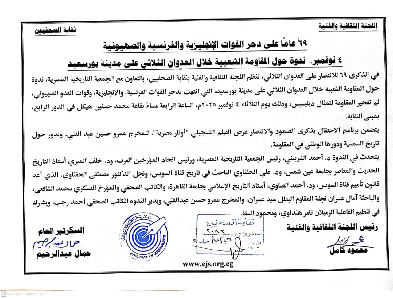تنظم اللجنة الثقافية والفنية بنقابة الصحفيين برئاسة محمود كامل، بالتعاون مع الجمعية التاريخية المصرية، ندوة حول المقاومة الشعبية خلال العدوان الثلاثي على مدينة بورسعيد، التي انتهت بدحر القوات الفرنسية، والإنجليزية، وقوات العدو الصهيوني، ثم تفجير المقاومة لتمثال ديليسبس.