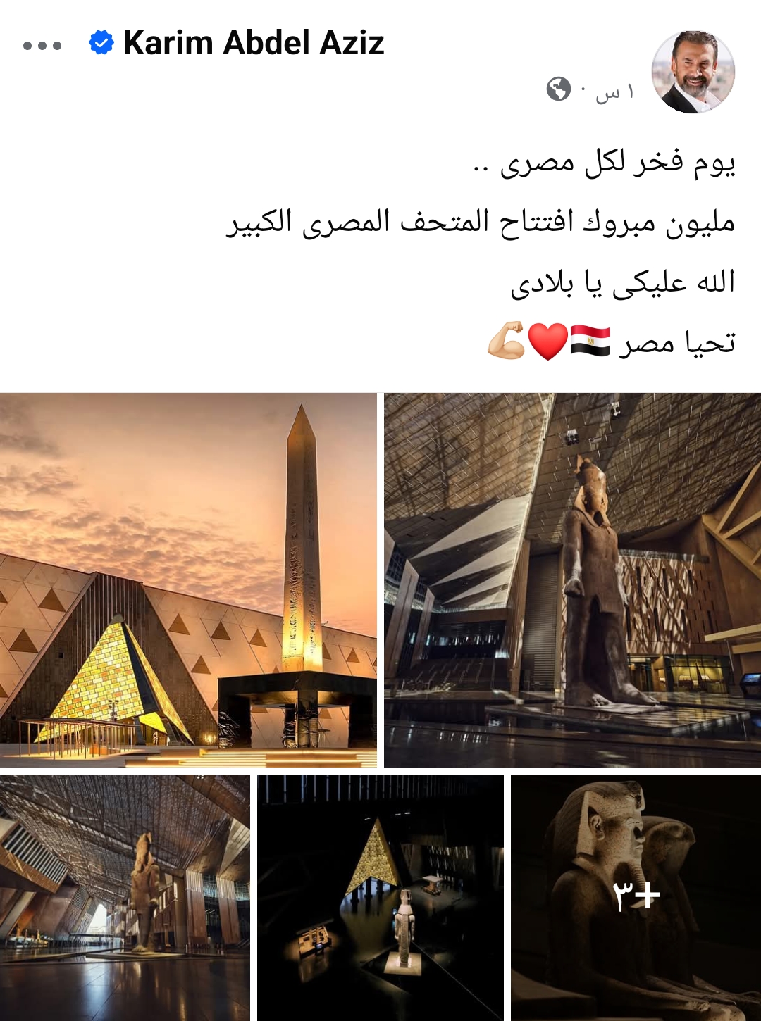 كريم عبد العزيز يحتفل بافتتاح المتحف المصري الكبير: "يوم فخر لكل مصري"