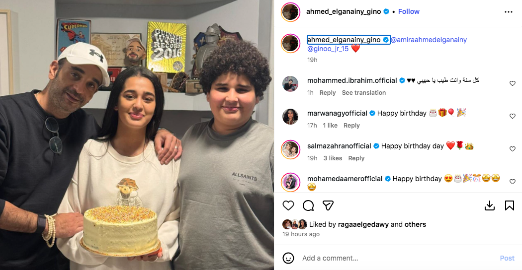ونشر أحمد الجنايني صورة عبر حسابه الرسمي على موقع إنستجرام، ظهر فيها مع أبنائه وهما يحملان تورتة عيد الميلاد، وسط أجواء عائلية مبهجة، فيما حرص عدد من أصدقائه وزملائه في الوسط الفني على تهنئته بهذه المناسبة.