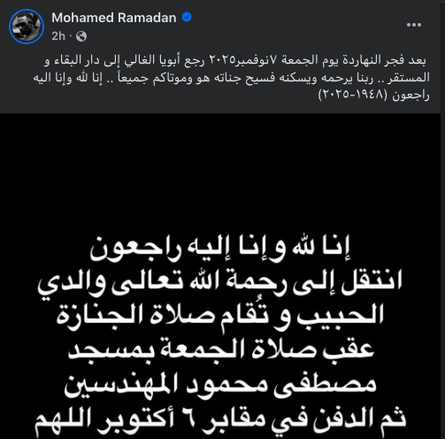 وكتب محمد رمضان منشوراً مؤثراً عبر صفحته الرسمية قائلًا: "بعد فجر النهاردة يوم الجمعة 7 نوفمبر 2025، رجع أبويا الغالي إلى دار البقاء والمستقر.. ربنا يرحمه ويسكنه فسيح جناته هو وموتاكم جميعًا.. إنا لله وإنا إليه راجعون (1948 - 2025)".