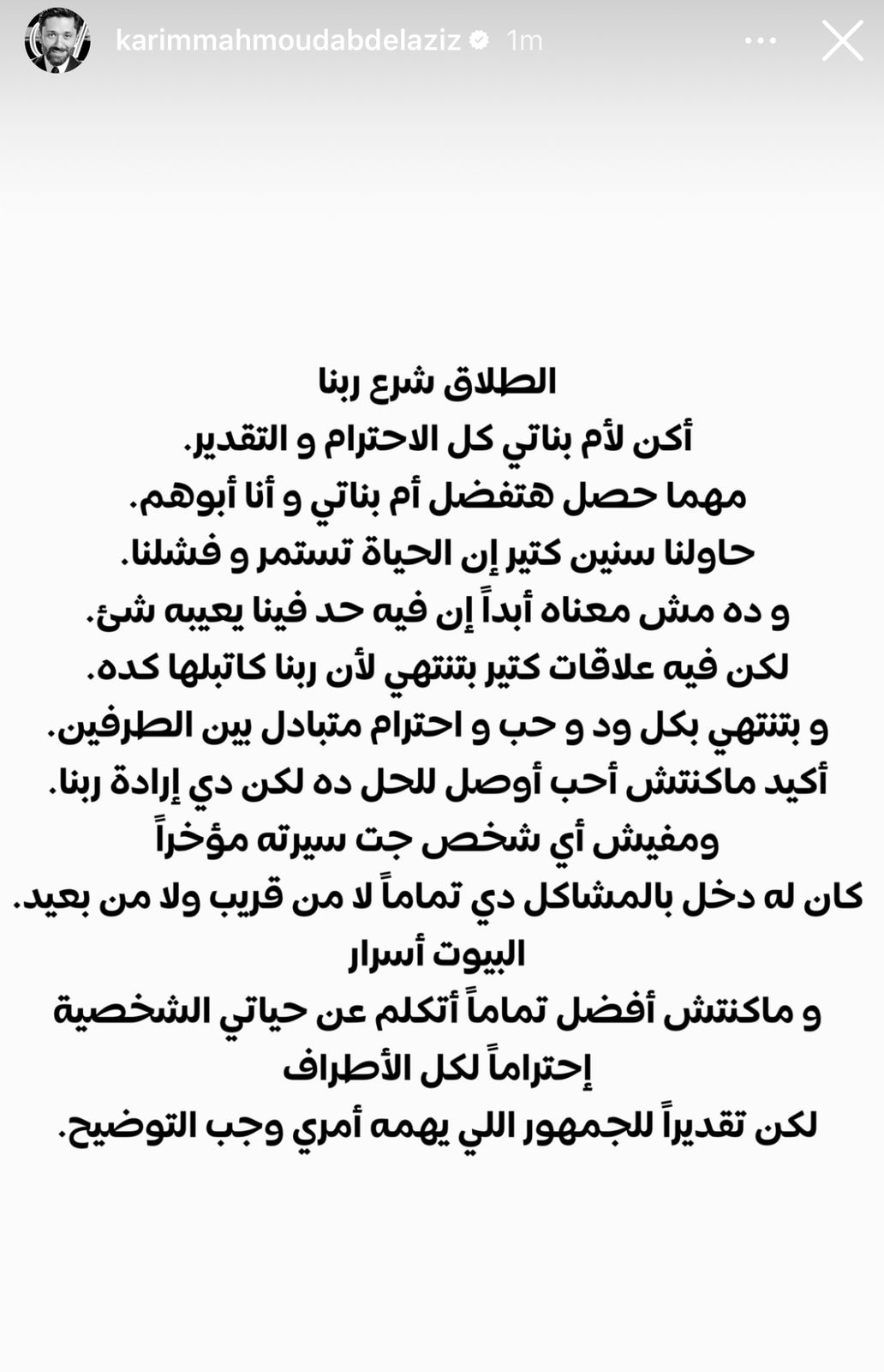 وختم كريم محمود عبد العزيز منشوره: «مكنتش أفضل تمامًا أتكلم عن حياتي الشخصية احترامًا لكل الأطراف.. لكن تقديرًا للجمهور اللي يهمه أمري وجب التوضيح».