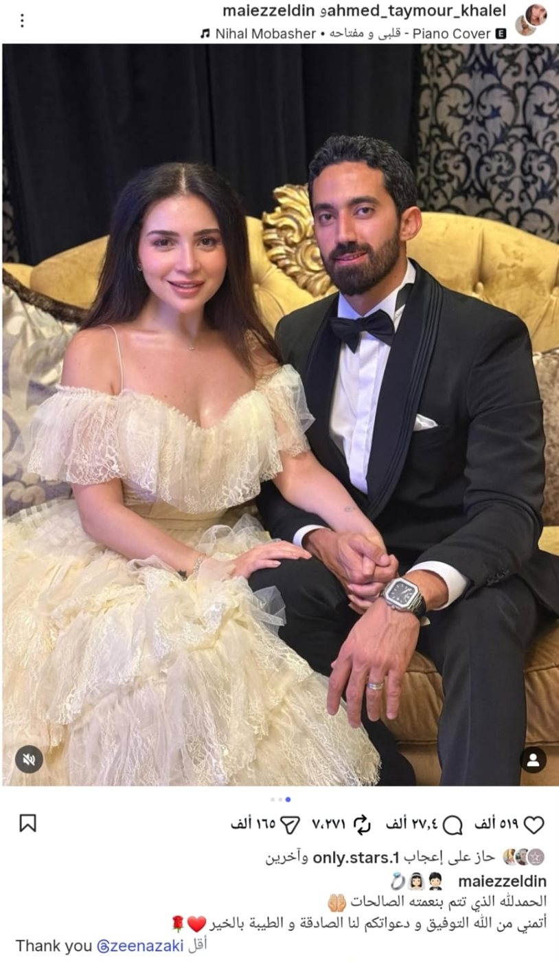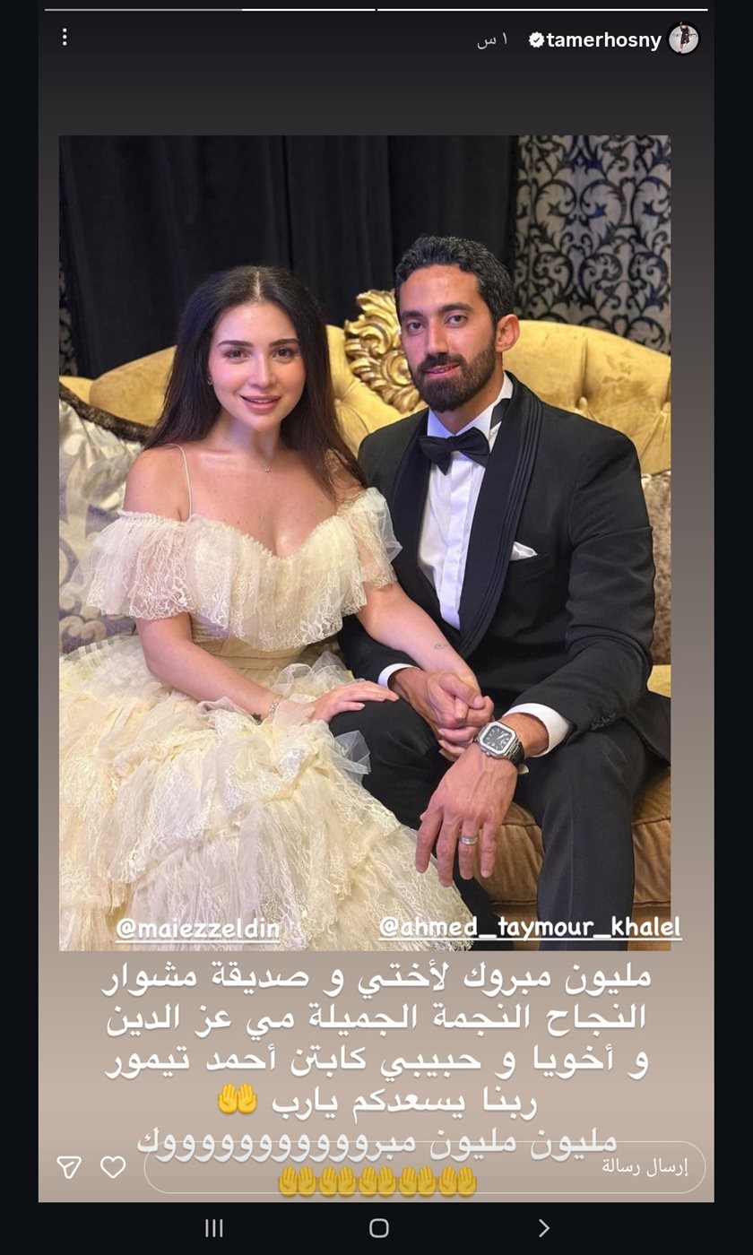 ونشر تامر عبر خاصية “ستوري” على حسابه الرسمي بموقع إنستجرام صورة للعروسين وعلق قائلًا: “مليون مبروك لأختي وصديقة مشوار النجاح النجمة الجميلة مي عز الدين وأخويا وحبيبي كابتن أحمد تيمور، ربنا يسعدكم يا رب.. مليون مليون مبرووووك”.