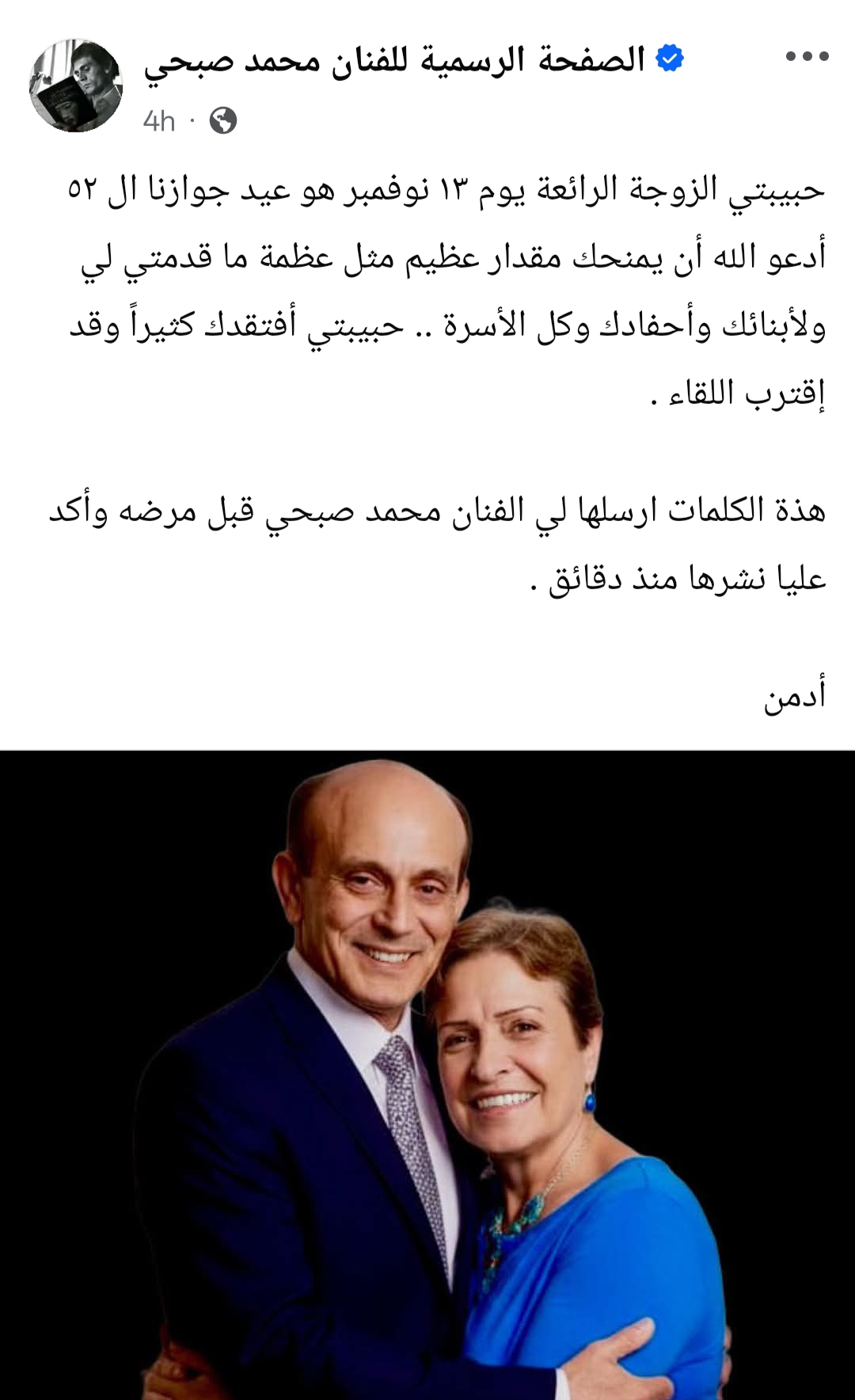 وكتب أدمن الصفحة الرسمية للفنان محمد صبحي على موقع التواصل الاجتماعي «فيس بوك»،: «حبيبتي الزوجة الرائعة يوم 13 نوفمبر هو عيد جوازنا الـ52، أدعو الله أن يمنحك مقدار عظيم مثل عظمة ما قدمتي لي ولأبنائك وأحفادك وكل الأسرة.. حبيبتي أفتقدك كثيرًا وقد اقترب اللقاء».
