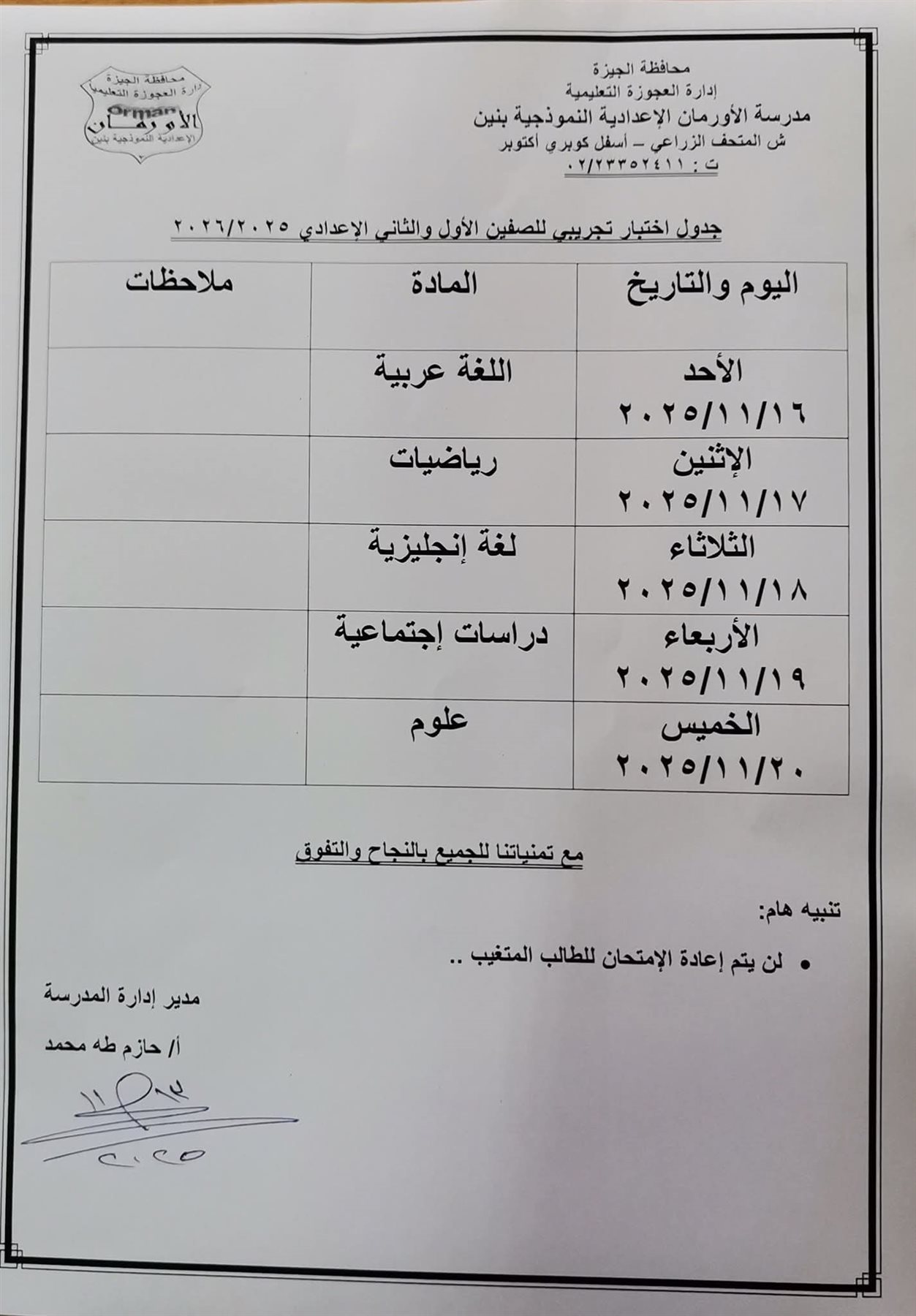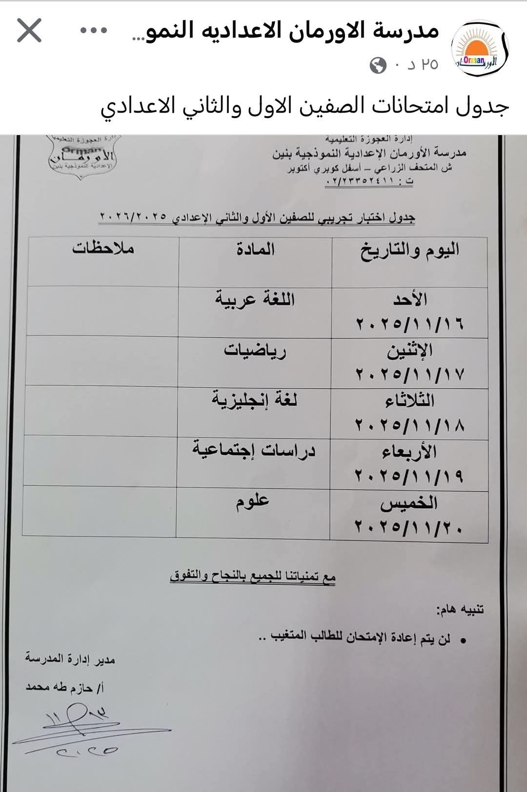 سادت حالة من الغضب والاستياء بين أولياء أمور وطلاب مدرسة الأورمان الإعدادية النموذجية بنين التابعة لإدارة العجوزة التعليمية بمحافظة الجيزة، بعد إعلان المدرسة عبر صفحتها الرسمية على «فيسبوك» اليوم الأربعاء 13 نوفمبر، عن جدول اختبار تجريبي لطلاب الصفين الأول والثاني الإعدادي.