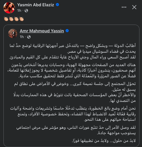 طالب الكاتب والمؤلف عمرو محمود ياسين الدولة بالتدخل العاجل عبر أجهزتها الرقابية لوضع حدٍّ لما وصفه بـ "الفوضى" التي تشهدها مواقع التواصل الاجتماعي في مصر، مؤكدًا أن السعي وراء المال والأرباح أصبح يتقدّم على القيم والمبادئ.