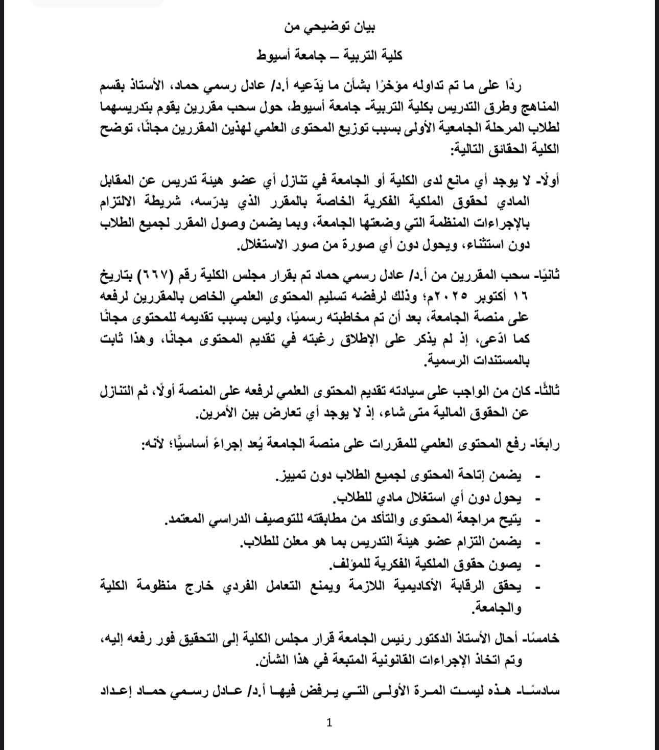 أوضحت الكلية أن سحب المقررين من الدكتور عادل رسمي تم بقرار مجلس الكلية رقم (667) بتاريخ 16 أكتوبر 2025، وذلك بعد رفضه تسليم المحتوى العلمي لرفعه على منصة الجامعة رغم مخاطبته رسميًا.