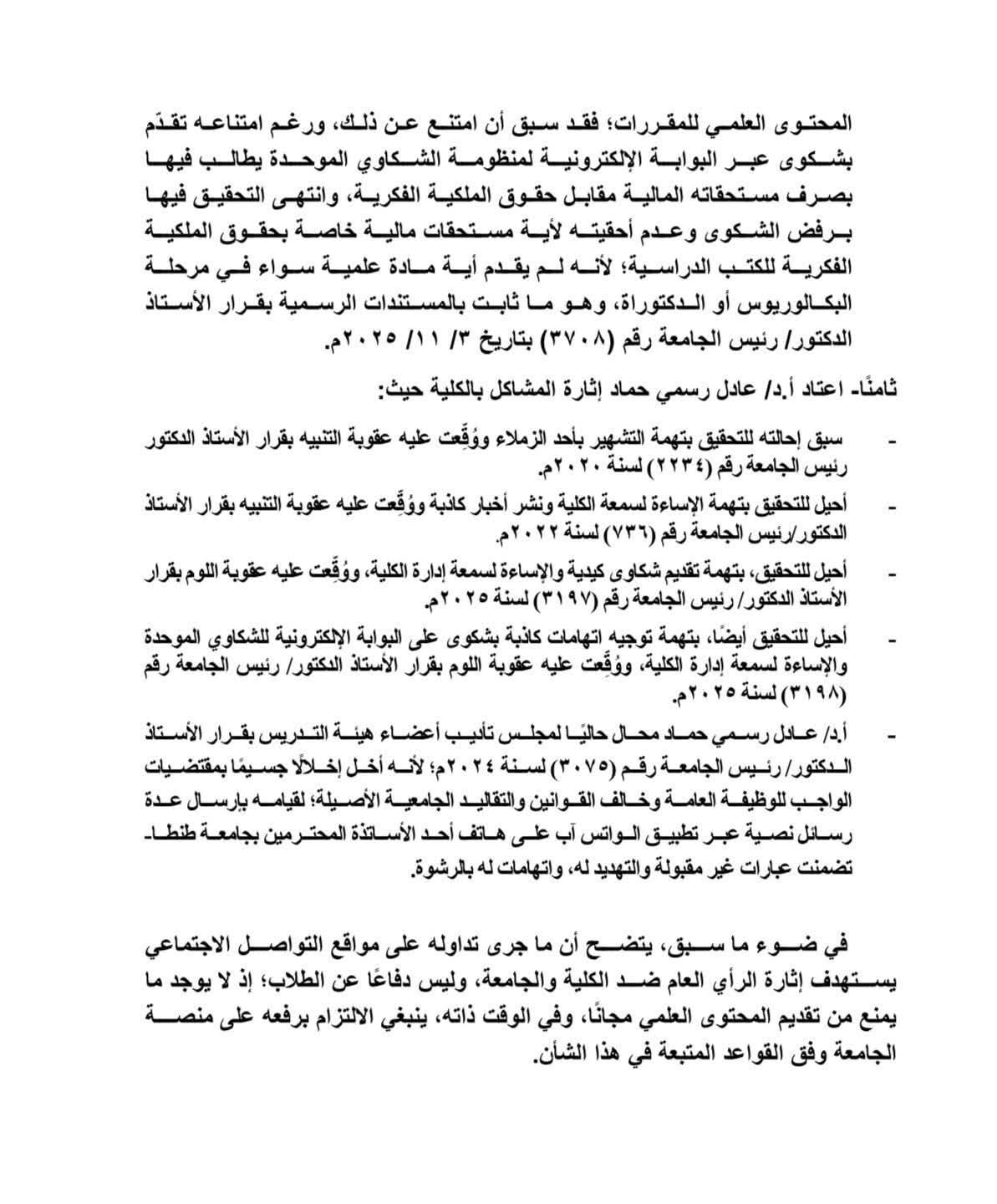 كما أوضح البيان أن الدكتور المذكور محال حاليًا لمجلس تأديب أعضاء هيئة التدريس بقرار رئيس الجامعة رقم 3075 لسنة 2024، بسبب إرساله رسائل نصية عبر "واتس آب" لأحد أساتذة جامعة طنطا، تضمّنت «عبارات غير لائقة واتهامات بالرشوة».