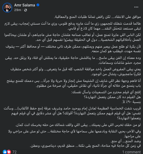 وكتب عمرو سلامة عبر حسابه الرسمي على موقع فيسبوك منشورًا مطوّلًا قال فيه: "موافق على الانتقاد.. لكن رافض تمامًا طلبات المنع والمعاقبة.. ما دام قدمت شغلك للجمهور، وزي ما أنت عايزه يدفع فلوس ومستني إعجاب، يبقى لازم تبقى مستعد تتحمّل النقد مهما كان لاذع أو قاسي".