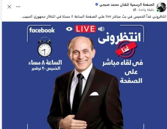 أعلن الفنان محمد صبحي عن ظهوره في بث مباشر غدًا الخميس في تمام الساعة الثامنة مساء عبر صفحته الرسمية على موقع “فيس بوك” داعيا جمهوره لمتابعته والتفاعل معه، حيث من المنتظر أن يتناول أحدث مستجدات أعماله الفنية ويجيب عن أسئلة متابعيه.