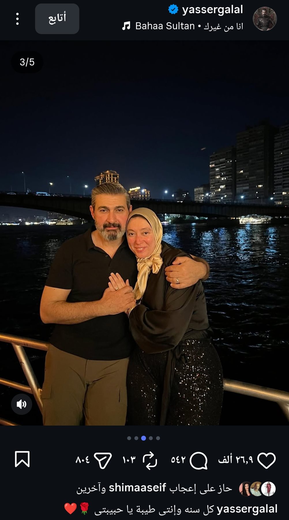 احتفل النجم ياسر جلال، بعيد زواجه، من خلال مشاركة جمهوره بجلسة تصوير جديدة جمعته بزوجته على ضفاف النيل.