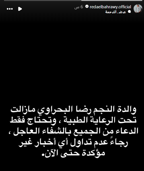وكتب رضا البحراوي منشورًا عبر حسابه الرسمي على موقع إنستجرام كشف فيه تطورات حالة والدته، قائلًا: "والدة النجم رضا البحراوي ما زالت تحت الرعاية الطبية، وتحتاج فقط إلى دعاء الجميع بالشفاء العاجل. برجاء عدم تداول أي أخبار غير مؤكدة حتى الآن".