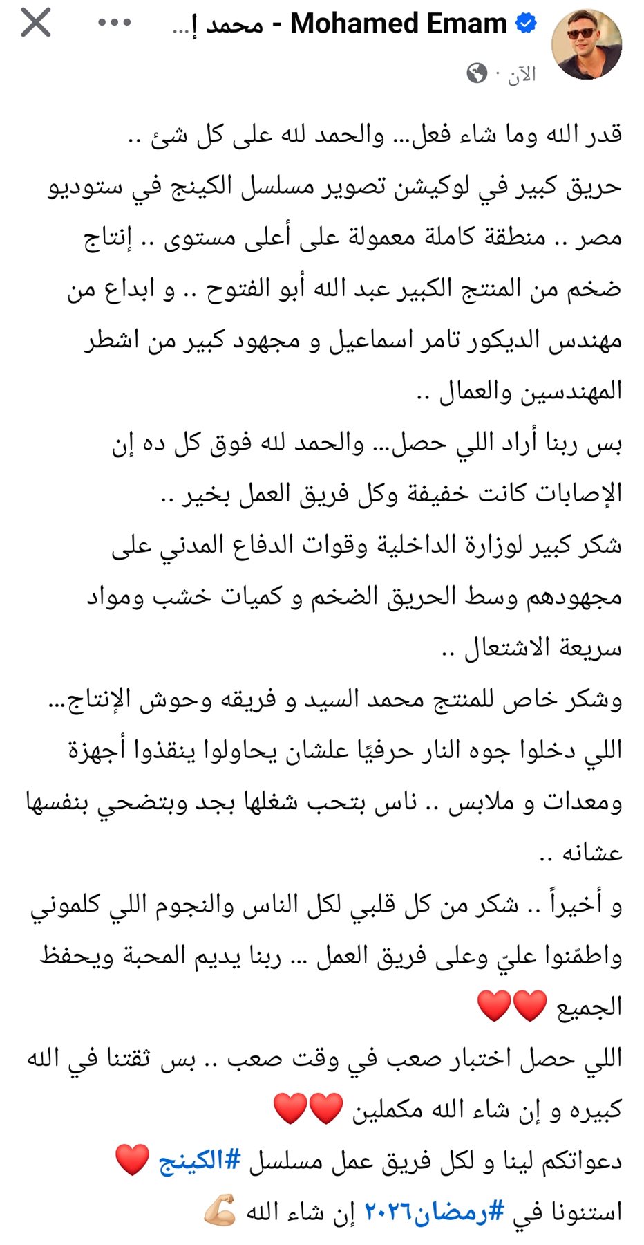 واختتم محمد إمام، قائلا: “أخيرًا.. شكر من كل قلبي لكل الناس والنجوم اللي كلموني واطمّنوا عليّ وعلى فريق العمل … ربنا يديم المحبة ويحفظ الجميع، اللي حصل اختبار صعب في وقت صعب.. بس ثقتنا في الله كبيره وإن شاء الله مكملين، دعواتكم لينا ولكل فريق عمل مسلسل #الكينج، استنونا في رمضان 2026 إن شاء الله”.