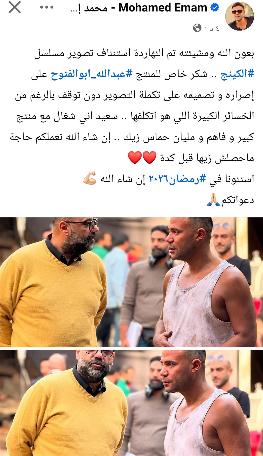 وعلق قائلا: “بعون الله ومشيئته تم النهاردة استئناف تصوير مسلسل الكينج.. شكر خاص للمنتج عبد الله أبو الفتوح على إصراره وتصميمه على تكملة التصوير دون توقف بالرغم من الخسائر الكبيرة اللي هو اتكلفها”.
