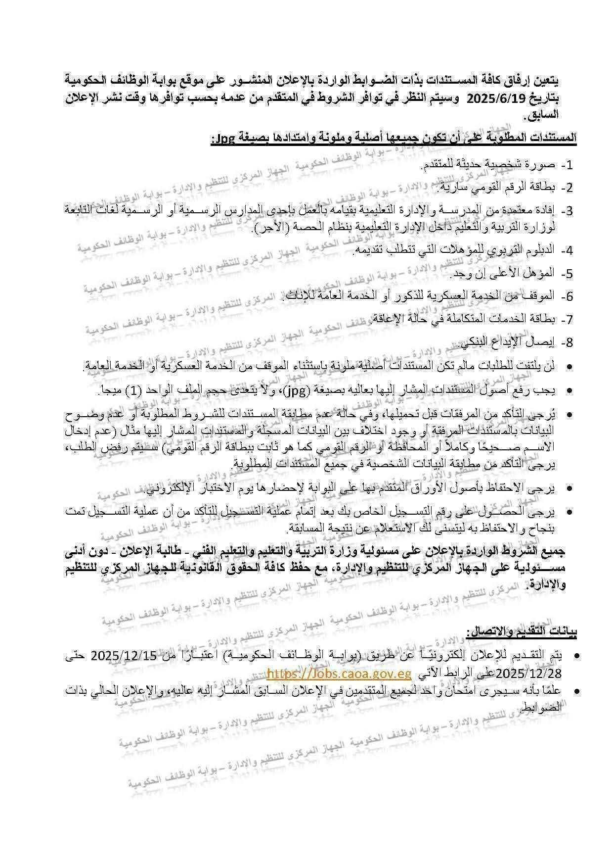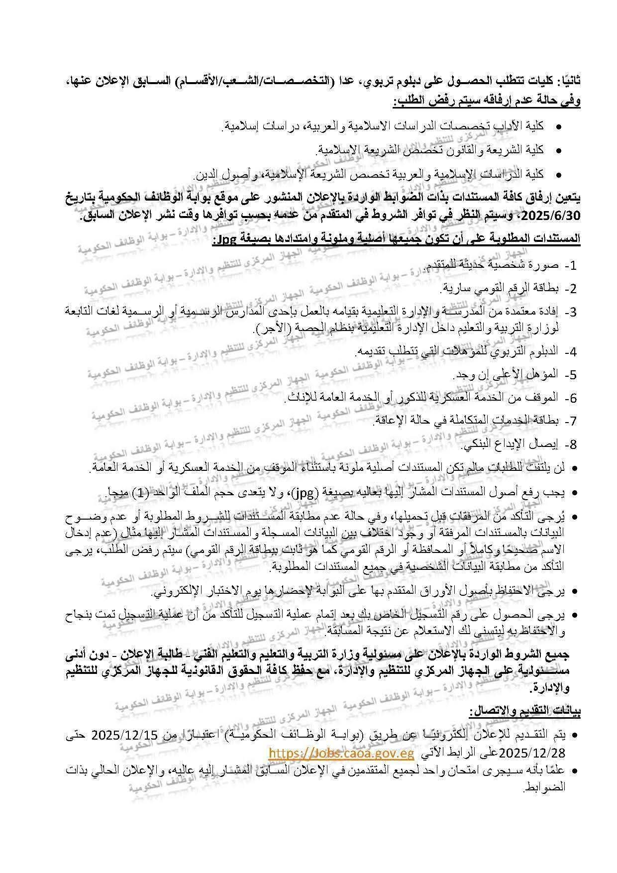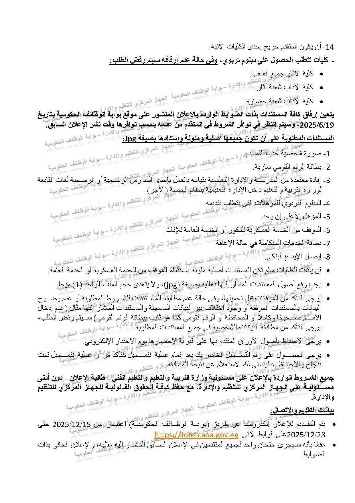 وأوضح الجهاز أن التسجيل سيبدأ رسميًا يوم 15 ديسمبر 2025، ويستمر حتى 28 ديسمبر 2025، وذلك عبر الموقع الإلكتروني للجهاز المركزي للتنظيم والإدارة، حيث يتم إدخال البيانات المطلوبة ورفع المستندات الرسمية وفق الضوابط المحددة. وشدد على أن التقديم يتم حصريًا عبر المنصة الإلكترونية ولن يتم قبول أي طلبات ورقية.