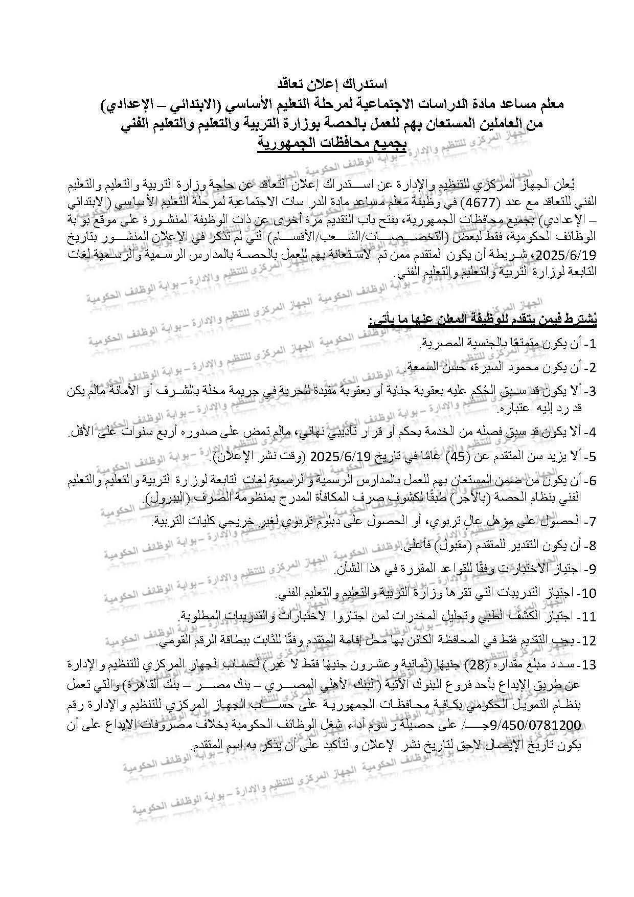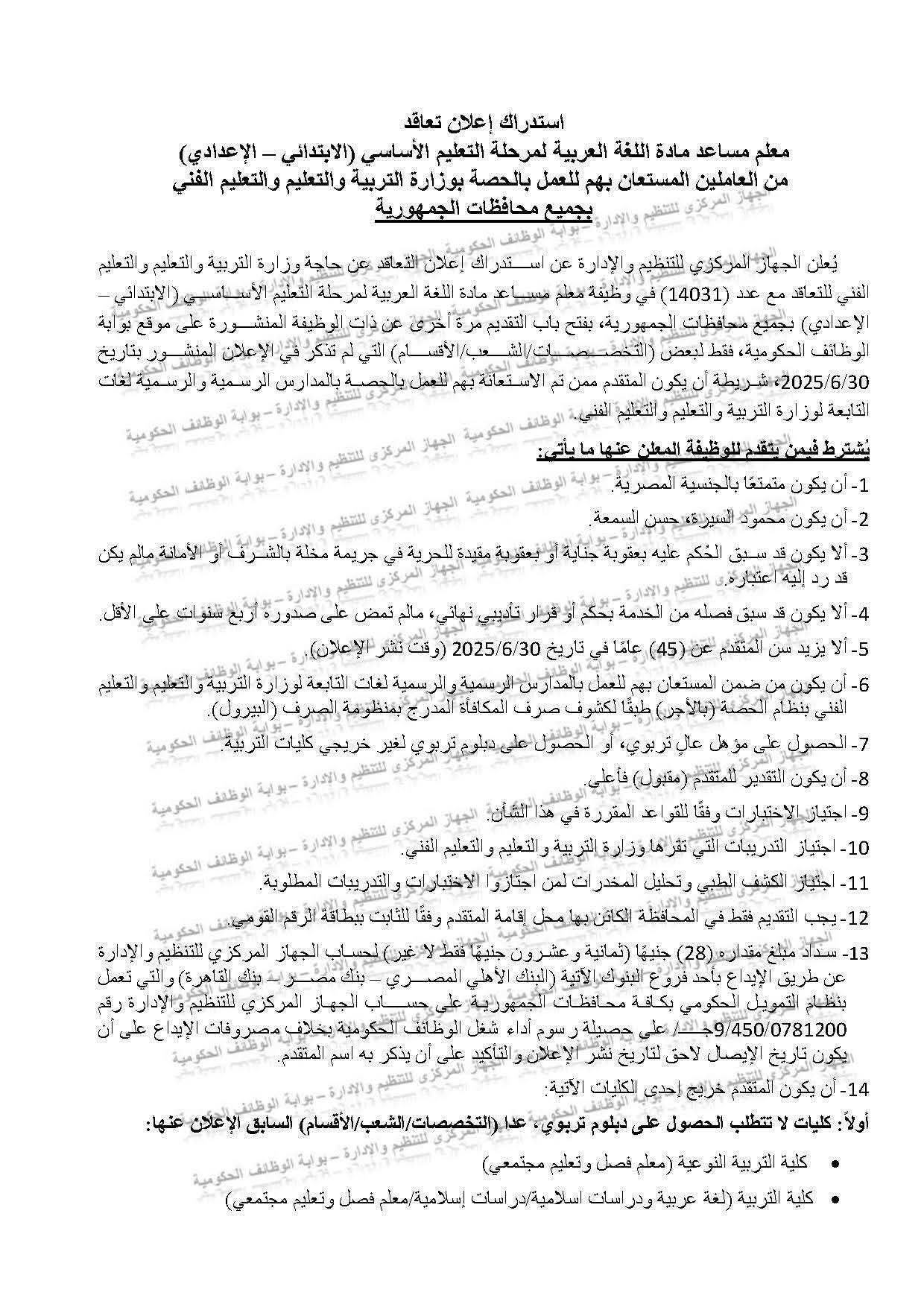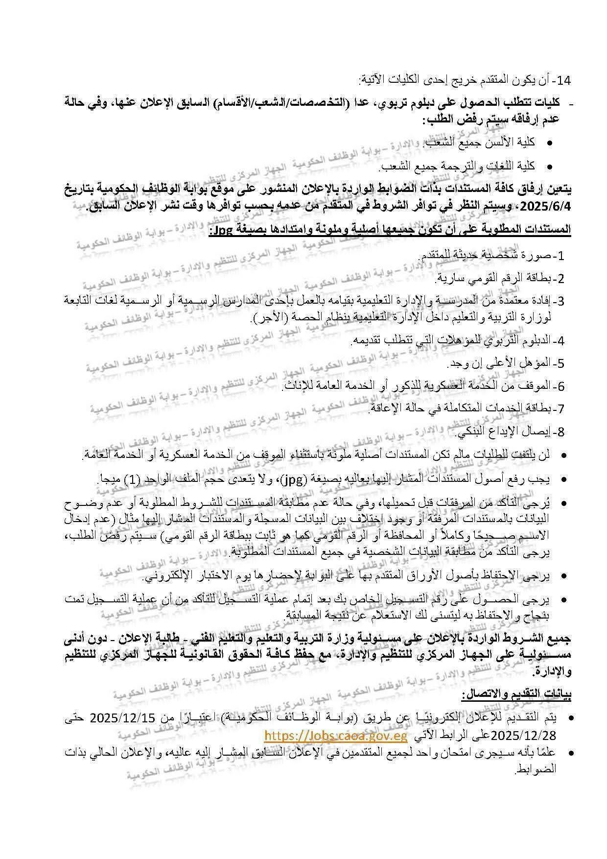 وأكد الجهاز أن التقديم سيشمل مواد: اللغة العربية، الدراسات الاجتماعية، العلوم، الرياضيات، واللغة الإنجليزية، وهي المواد التي تشهد احتياجًا متزايدًا في مختلف المحافظات. ويأتي هذا الإعلان تماشيًا مع سياسة الدولة في رفع كفاءة وجودة التعليم، وضمان توفير معلمين متخصصين قادرين على التعامل مع طلاب المراحل التعليمية المختلفة.