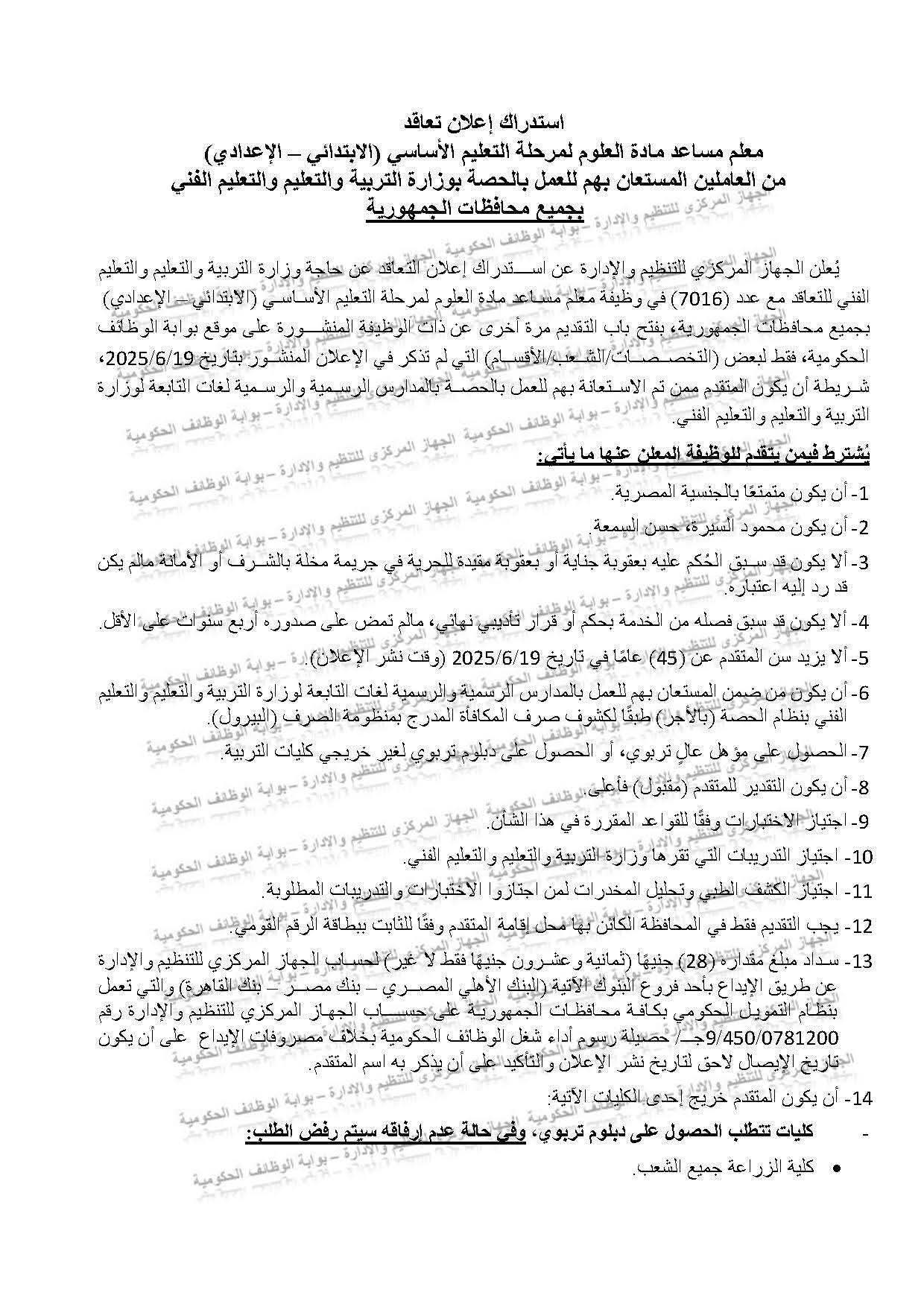 أعلن الجهاز المركزي للتنظيم والإدارة فتح باب التسجيل الإلكتروني للراغبين في التقديم للعمل بنظام معلم الحصة في عدد من المواد الأساسية، وذلك في إطار خطة الوزارة لسد العجز بالمدارس وتوفير كوادر تعليمية مؤهلة قادرة على دعم العملية التعليمية خلال العام الدراسي 2025/2026.