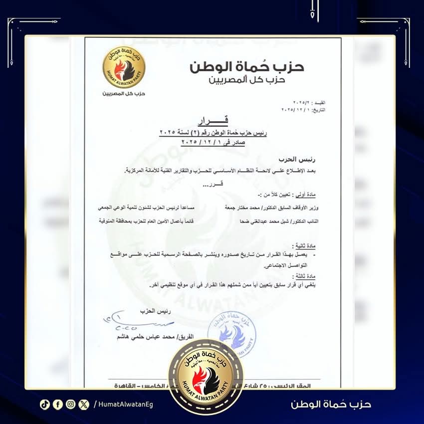 كما قرر رئيس حزب حماة الوطن إلغاء ما يخالف ذلك من قرارات، وتنفذ القرار الجديدة من تاريخ صدورها.