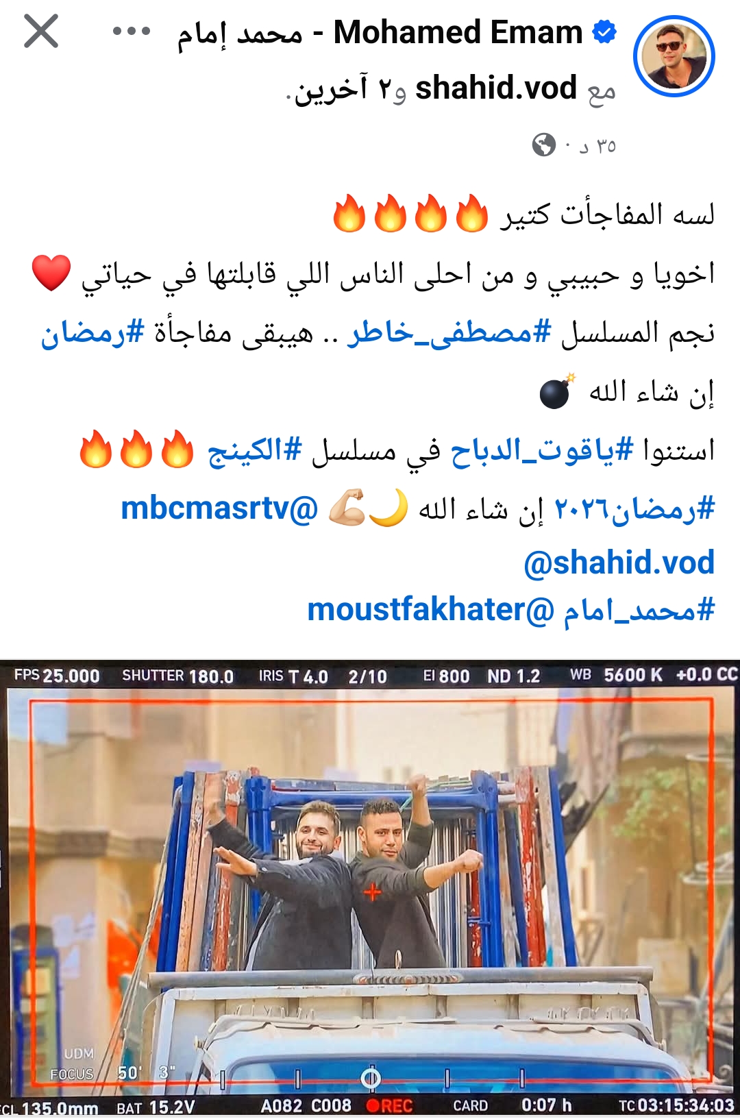 وعلق قائلا: “لسه المفاجأت كتير، اخويا وحبيبي ومن أحلى الناس اللي قابلتها في حياتي، نجم المسلسل مصطفى خاطر.. هيبقى مفاجأة رمضان إن شاء الله، استنوا ياقوت الدباح في مسلسل الكينج، رمضان 2026 إن شاء الله”.