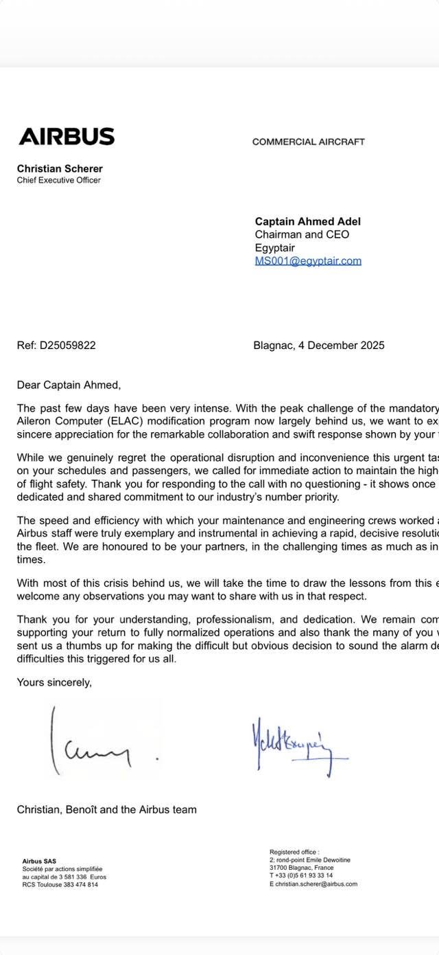 في إطار التعاون الوثيق بين شركة إيرباص ومصر للطيران، وجّهت إيرباص خطابًا رسميًا للطيار أحمد عادل رئيس الشركة الوطنية لمصر للطيران، أعربت فيه إيرباص عن تقديرها الكبير للدور المحوري الذي قامت به فرق مصر للطيران خلال تنفيذ برنامج التعديل الإلزامي لنظام كمبيوتر الجنيحات (ELAC) وذلك لتفادي الأزمة العالمية التي لحقت بطائرات إيرباص A320. وجاء الخطاب الموجه من إيرباص ليؤكد على عمق الشراكة بين الجانبين، ويشيد بمستوى الاحترافية والاستجابة السريعة التي أظهرتها فرق الصيانة والهندسة في مصر للطيران، خلال واحدة من أكثر الفترات التشغيلية تحديًا في الأسطول.