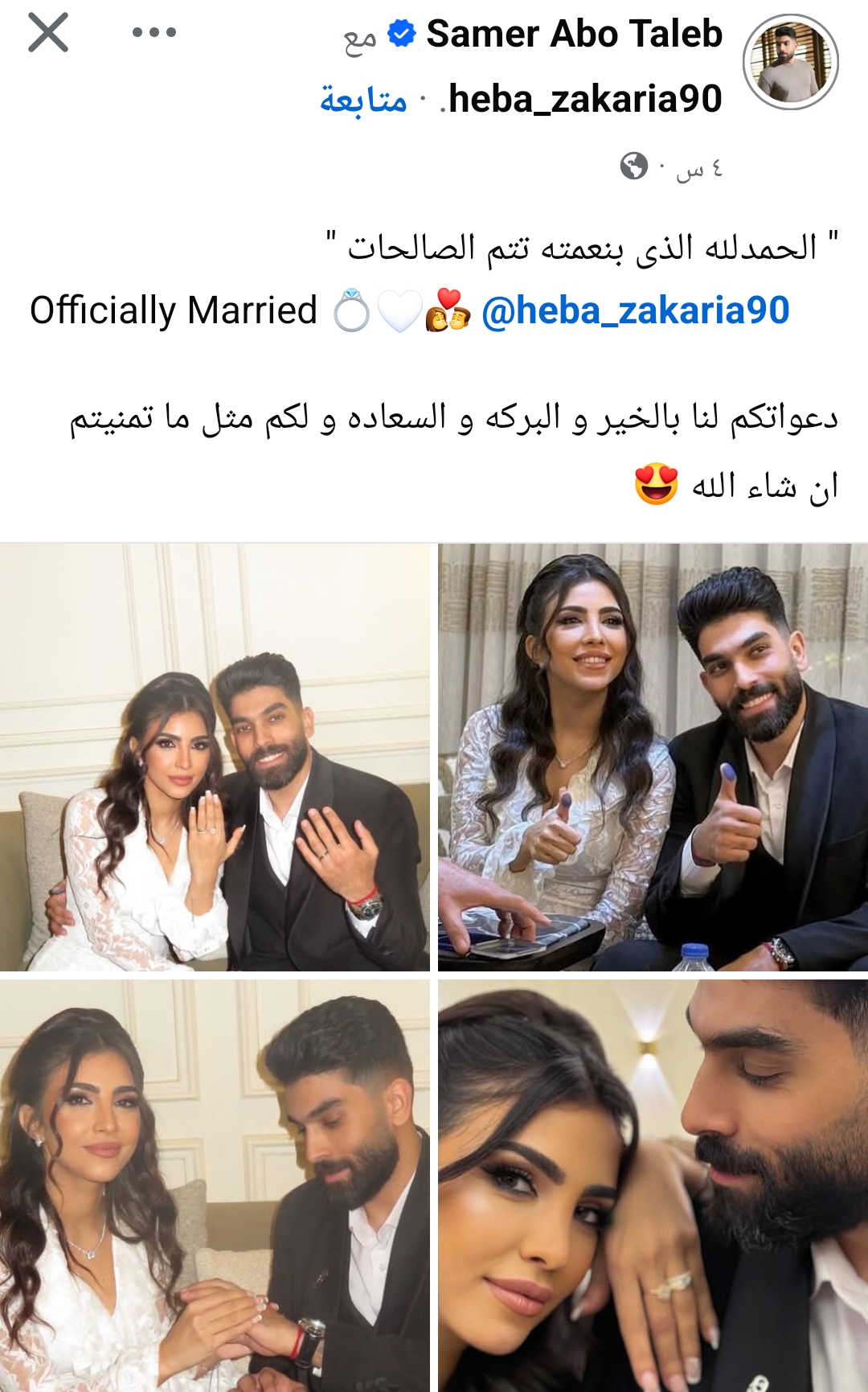 ونشر سامر أبو طالب، مجموعة صور له من عقد قرانه، عبر حسابه الشخصي بموقع التواصل الاجتماعي فيسبوك، وعلق قائلا: "الحمد لله الذي بنعمته تتم الصالحات.. رسميًا تزوجنا.. دعواتكم لنا بالخير والبركة والسعادة، ولكم مثل ما تمنيتم إن شاء الله".